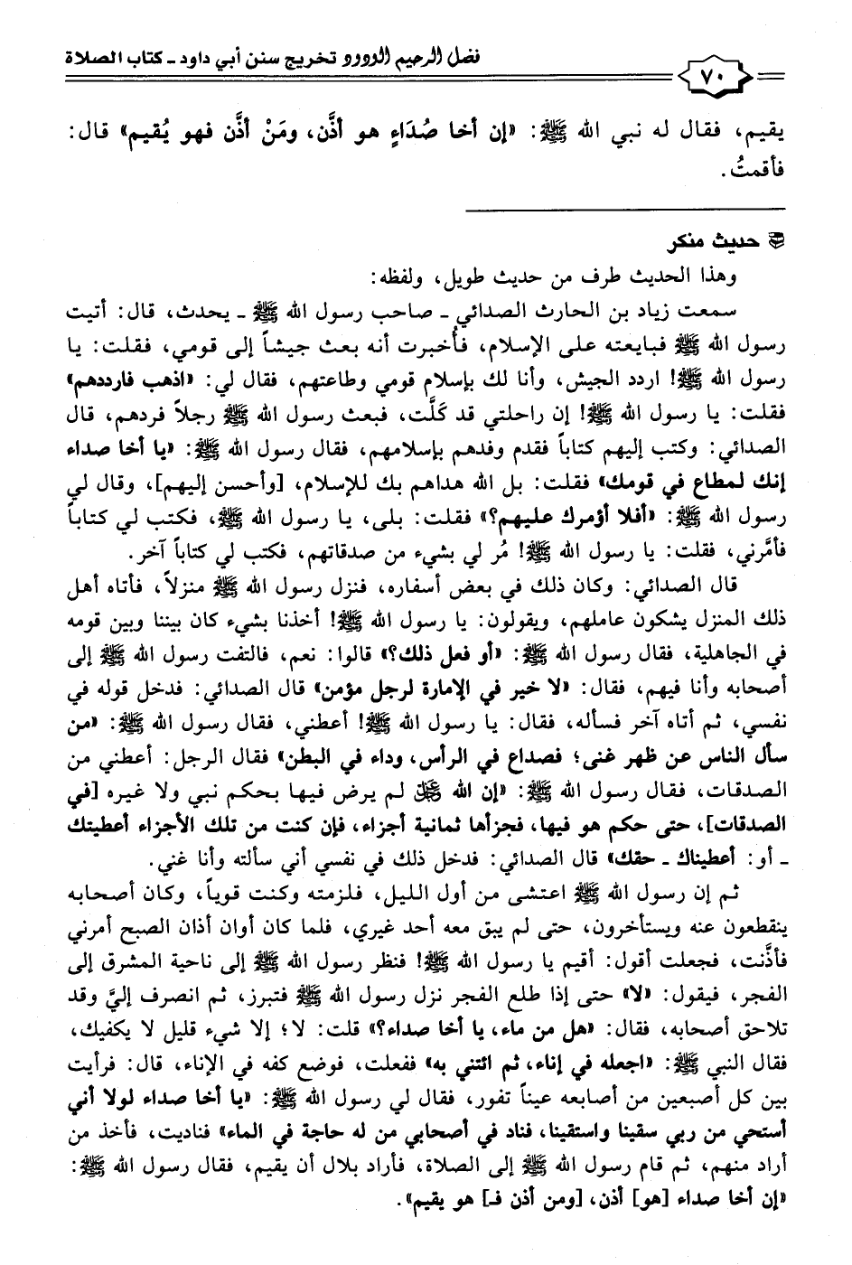 سمعت زياد بن الحارث الصدائي -صاحب رسول الله - صلى الله عليه وسلم - - يحدث، قال: أتيت رسول الله - صلى الله عليه وسلم - فبايعته على الإسلام، فأُخبرت أنه بعث جيشًا إلى قومي، فقلت: يا رسول الله - صلى الله عليه وسلم -! اردد الجيش، وأنا لك بإسلام قومي وطاعتهم، فقال لي: "اذهب فارددهم" فقلت: يا رسول الله - صلى الله عليه وسلم -! إن راحلتي قد كَلَّت، فبعث رسول الله - صلى الله عليه وسلم - رجلًا فردهم، قال الصدائي: وكتب إليهم كتابًا فقدم وفدهم بإسلامهم، فقال رسول الله - صلى الله عليه وسلم -: "يا أخا صداء إنك لمطاع في قومك" فقلت: بل الله هداهم بك للإسلام، [وأحسن إليهم]، وقال لي رسول الله - صلى الله عليه وسلم -: "أفلا أؤمرك عليهم؟ " فقلت: بلى، يا رسول الله - صلى الله عليه وسلم -، فكتب لي كتابًا فأمَّرني، فقلت: يا رسول الله - صلى الله عليه وسلم -! مُر لي بشيء من صدقاتهم، فكتب لي كتابًا آخر.
