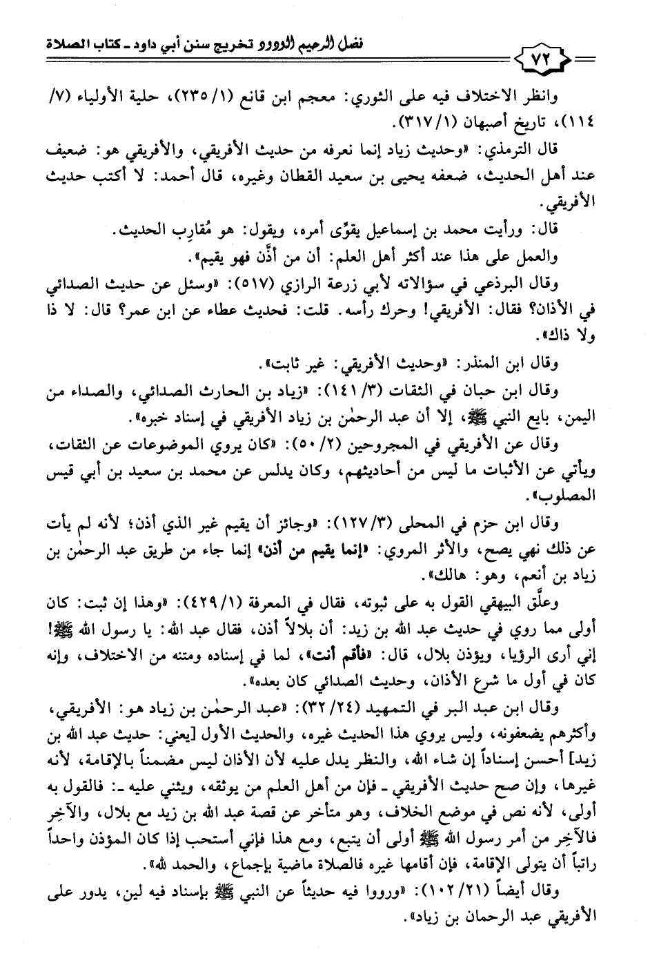 وقال البرذعي في سؤالاته لأبي زرعة الرازي (٥١٧): "وسئل عن حديث الصدائي في الأذان؟ فقال: الأفريقي! وحرك رأسه. قلت: فحديث عطاء عن ابن عمر؟ قال: لا ذا ولا ذاك".