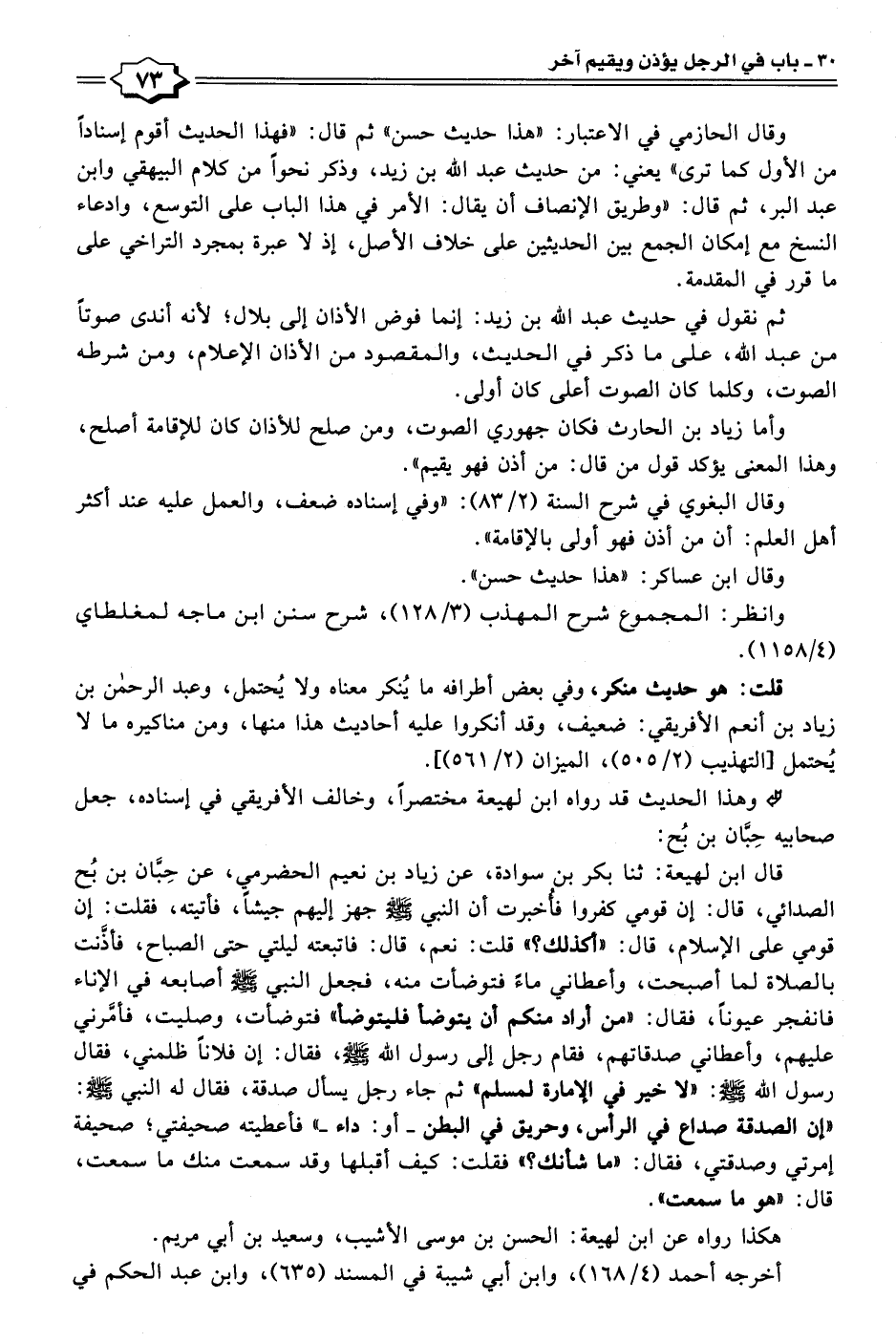 وقال الحازمي في الاعتبار: "هذا حديث حسن" ثم قال: "فهذا الحديث أقوم إسنادًا من الأول كما ترى" يعني: من حديث عبد الله بن زيد، وذكر نحوًا من كلام البيهقي وابن عبد البر، ثم قال: "وطريق الإنصاف أن يقال: الأمر في هذا الباب على التوسع، وادعاء النسخ مع إمكان الجمع بين الحديثين على خلاف الأصل، إذ لا عبرة بمجرد التراخي على ما قرر في المقدمة.