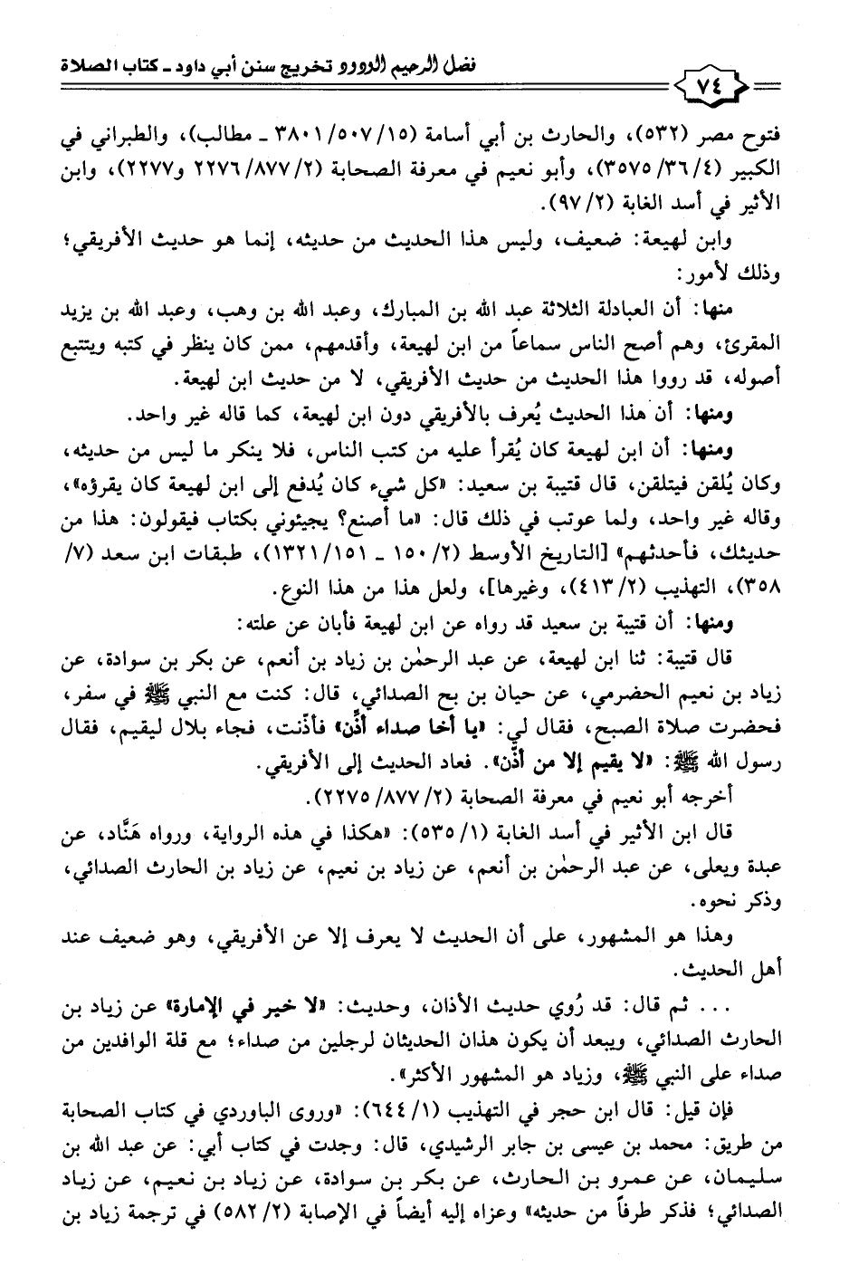 ... ثم قال: قد رُوي حديث الأذان، وحديث: "لا خير في الإمارة" عن زياد بن الحارث الصدائي، ويبعد أن يكون هذان الحديثان لرجلين من صداء؛ مع قلة الوافدين من صداء على النبي - صلى الله عليه وسلم -، وزياد هو المشهور الأكثر".