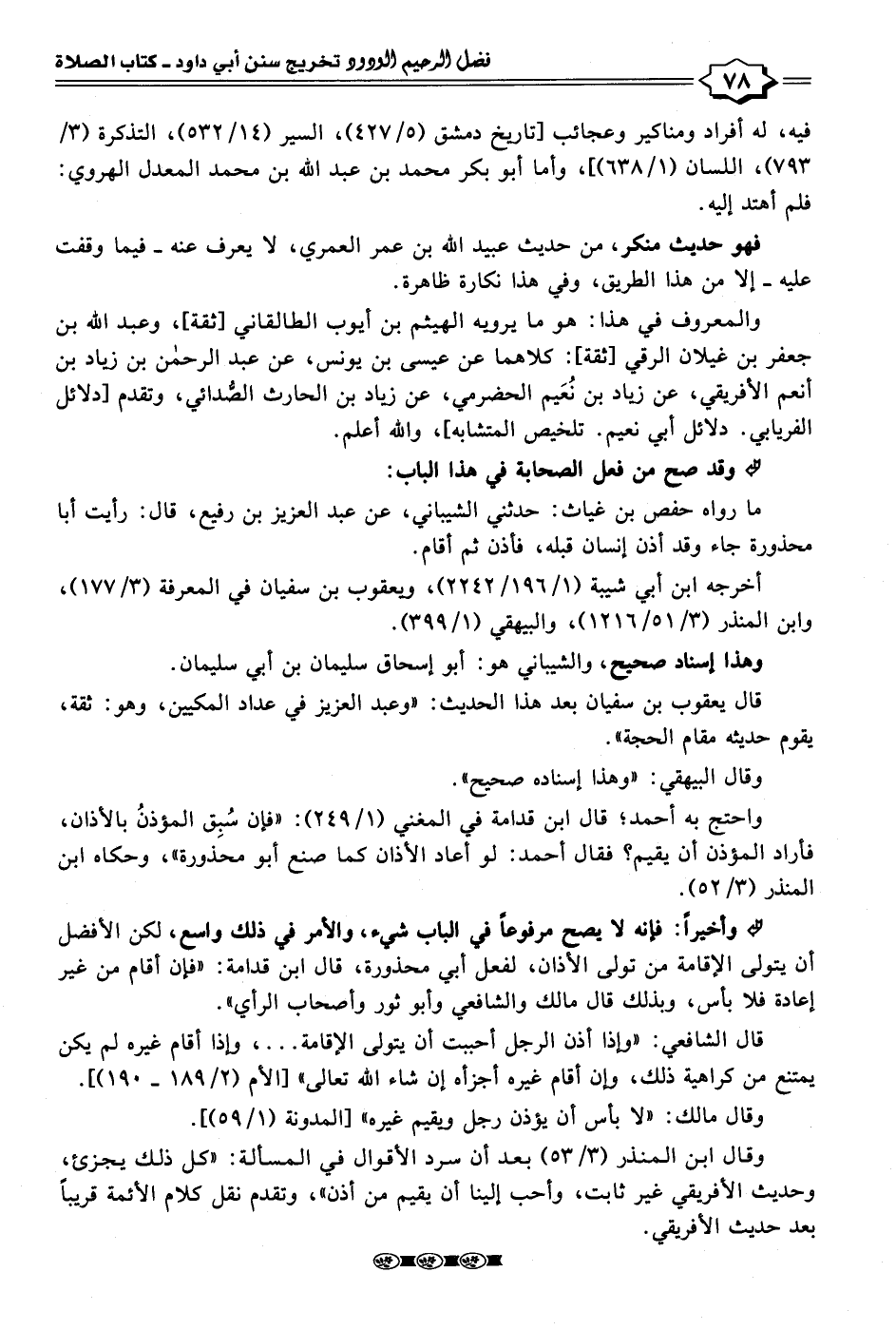 • وأخيرًا: فإنه لا يصح مرفوعًا في الباب شيء، والأمر في ذلك واسع، لكن الأفضل أن يتولى الإقامة من تولى الأذان، لفعل أبي محذورة، فال ابن قدامة: "فإن أقام من غير إعادة فلا بأس، وبذلك قال مالك والشافعي وأبو ثور وأصحاب الرأي".