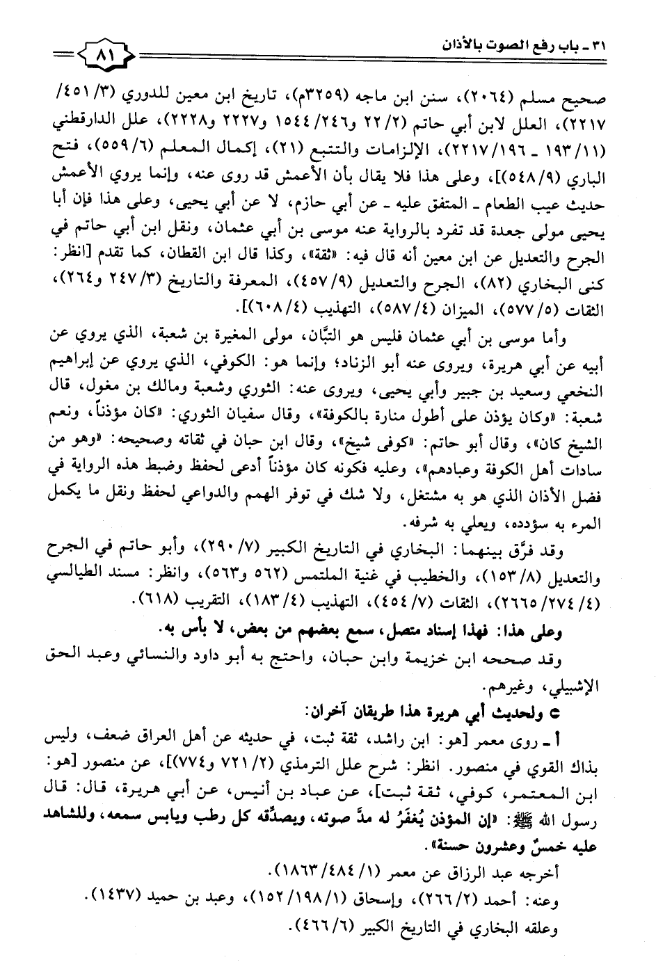 وأما موسى بن أبي عثمان فليس هو التبَّان، مولى المغيرة بن شعبة، الذي يروي عن أبيه عن أبي هريرة، ويروى عنه أبو الزناد؛ وإنما هو: الكوفي، الذي يروي عن إبراهيم النخعي وسعيد بن جبير وأبي يحيى، ويروى عنه: الثوري وشعبة ومالك بن مغول، قال شعبة: "وكان يؤذن على أطول منارة بالكوفة"، وقال سفيان الثوري: "كان مؤذنًا، ونعم الشيخ كان"، وقال أبو حاتم: "كوفى شيخ"، وقال ابن حبان في ثقاته وصحيحه: "وهو من سادات أهل الكوفة وعبادهم"، وعليه فكونه كان مؤذنًا أدعى لحفظ وضبط هذه الرواية في فضل الأذان الذي هو به مشتغل، ولا شك في توفر الهمم والدواعي لحفظ ونقل ما يكمل المرء به سؤدده، ويعلي به شرفه.