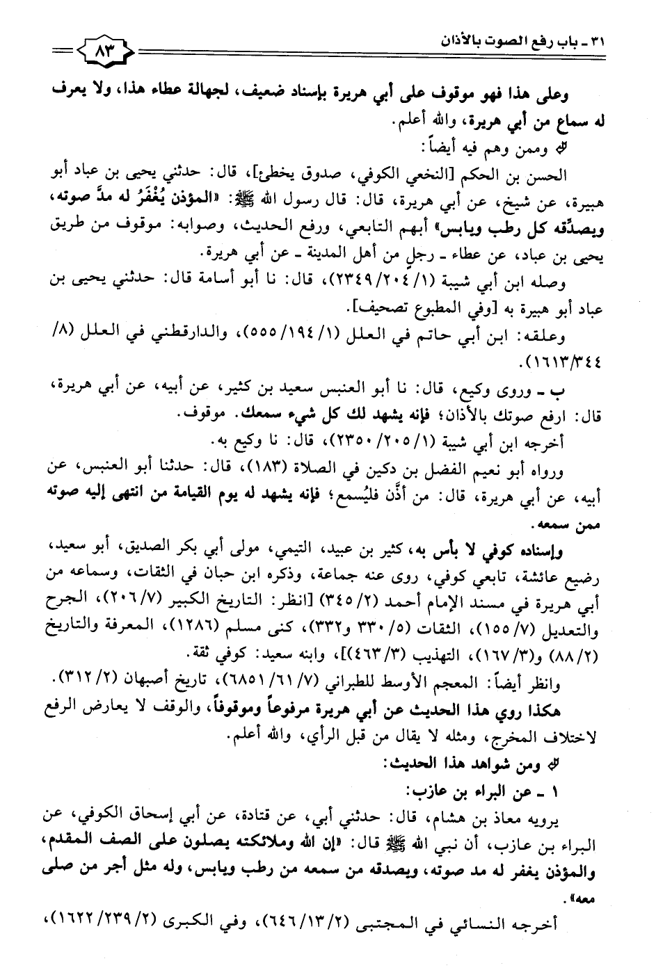 ب- وروى وكيع، قال: نا أبو العنبس سعيد بن كثير، عن أبيه، عن أبي هريرة، قال: ارفع صوتك بالأذان؛ فإنه يشهد لك كل شيء سمعك. موقوف.