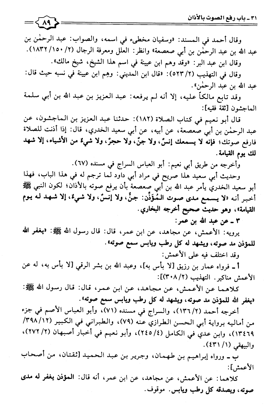 عبد الرحمن بن أبي صعصعة، عن أبيه، عن أبي سعيد الخدري، قال: إذا أذنت للصلاة فارفع صوتك؛ فإنه لا يسمعك إنسٌ، ولا جنٌّ، ولا حجرٌ، ولا شيءٌ من الأشياء، إلا شهد لك يوم القيامة.