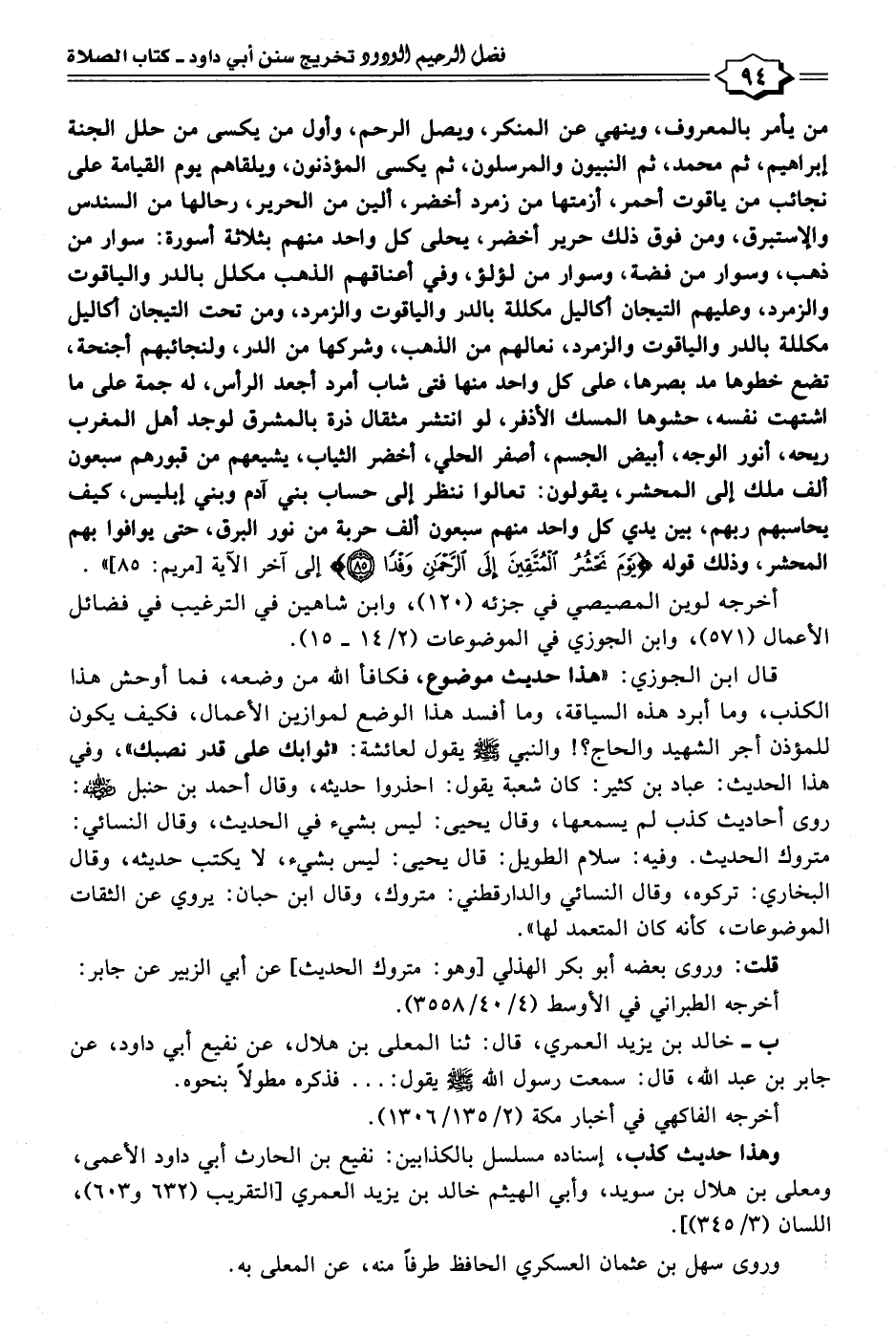 قال ابن الجوزي: "هذا حديث موضوع، فكافأ الله من وضعه، فما أوحش هذا الكذب، وما أبرد هذه السياقة، وما أفسد هذا الوضع لموازين الأعمال، فكيف يكون للمؤذن أجر الشهيد والحاج؟! والنبي - صلى الله عليه وسلم - يقول لعائشة: "ثوابك على قدر نصبك"، وفي هذا الحديث: عباد بن كثير: كان شعبة يقول: احذروا حديثه، وقال أحمد بن حنبل - رضي الله عنه -: روى أحاديث كذب لم يسمعها، وقال يحيى: ليس بشيء في الحديث، وقال النسائي: متروك الحديث. وفيه: سلام الطويل: قال يحيى: ليس بشيء، لا يكتب حديثه، وقال البخاري: تركوه، وقال النسائي والدارقطني: متروك، وقال ابن حبان: يروي عن الثقات الموضوعات، كأنه كان المتعمد لها".
