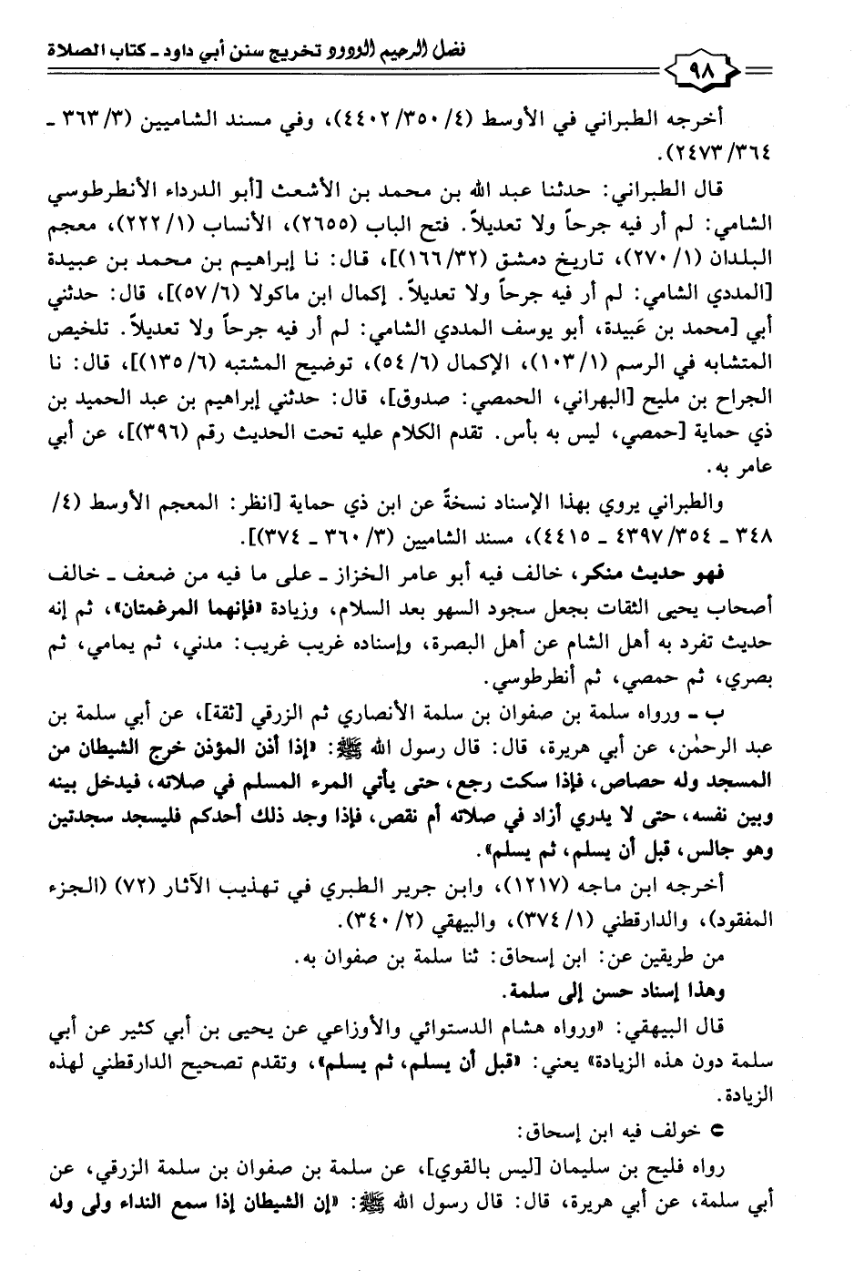 ب- ورواه سلمة بن صفوان بن سلمة الأنصاري ثم الزرقي [ثقة]، عن أبي سلمة بن عبد الرحمن، عن أبي هريرة، قال: قال رسول الله - صلى الله عليه وسلم -: "إذا أذن المؤذن خرج الشيطان من المسجد وله حصاص، فإذا سكت رجع، حتى يأتي المرء المسلم في صلاته، فيدخل بينه وبين نفسه، حتى لا يدري أزاد في صلاته أم نقص، فإذا وجد ذلك أحدكم فليسجد سجدتين وهو جالس، قبل أن يسلم، ثم يسلم".