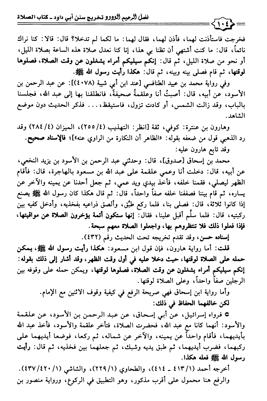 محمد بن إسحاق [صدوق]، قال: وحدثني عبد الرحمن بن الأسود بن يزيد النخعي، عن أبيه، قال: دخلت أنا وعمي علقمة على عبد الله بن مسعود بالهاجرة، قال: فأقام الظهر ليصلي، فقمنا خلفه، فأخذ بيدي ويد عمي، ثم جعل أحدنا عن يمينه والآخر عن يساره، ثم قام بيننا فصففنا خلفه صفًا واحدًا، قال: ثم قال هكذا كان رسول الله - صلى الله عليه وسلم - يصنع إذا كانوا ثلاثة، قال: فصلى بنا، فلما ركع طبَّق، وألصق ذراعيه بفخذيه، وأدخل كفيه بين ركبتيه، قال: فلما سلَّم أقبل علينا، فقال: إنها ستكون أئمة يؤخرون الصلاة عن مواقيتها، فإذا فعلوا ذلك فلا تنتظروهم بها، واجعلوا الصلاة معهم سبحة.