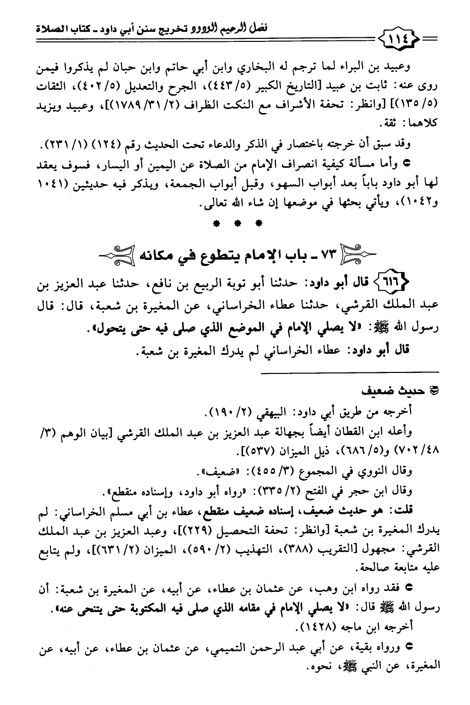 ٦١٦ - قال أبو داود: حدثنا أبو توبة الربيع بن نافع، حدثنا عبد العزيز بن عبد الملك القرشي، حدثنا عطاء الخراساني، عن المغيرة بن شعبة، قال: قال رسول الله - صلى الله عليه وسلم -: "لا يصلي الإمام في الموضع الذي صلى فيه حتى يتحول".