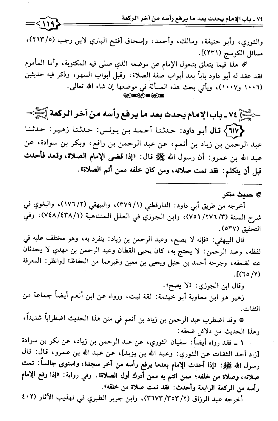 ١ - فقد رواه أيضًا: سفيان الثوري، عن عبد الرحمن بن زياد، عن بكر بن سوادة [زاد أحد الثقات عن الثوري: وعبد الله بن يزيد]، عن عبد الله بن عمرو، قال: قال رسول الله - صلى الله عليه وسلم -: "إذا أحدث الإمام بعدما يرفع رأسه من آخر سجدة، واستوى جالسًا: تمت صلاته، وصلاة من خلفه؛ ممن ائتم به ممن أدرك أول الصلاة". وفي رواية: "إذا رفع الإمام رأسه من الركعة الرابعة وأحدث: فقد تمت صلاة من خلفه".
