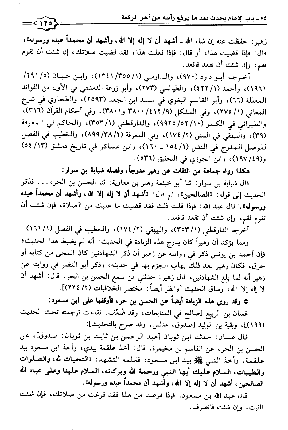 قال شبابة بن سوار: ثنا أبو خيثمة زهير بن معاوية: ثنا الحسن بن الحر،. . . فذكر الحديث إلى قوله: "الصالحين"، ثم قال: "أشهد أن لا إله إلا الله، وأشهد أن محمدًا عبده ورسوله". قال عبد الله: فإذا قلت ذلك فقد قضيت ما عليك من الصلاة، فإن شئت أن تقوم فقم، وإن شئت أن تقعد فاقعد.