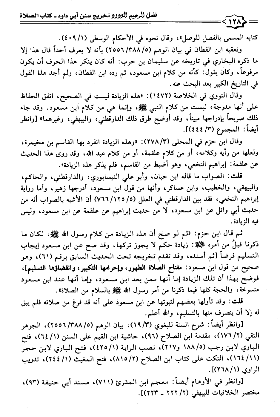 ثم قال ابن حزم: "ثم لو صح أن هذه الزيادة من كلام رسول الله - صلى الله عليه وسلم -، لكان ما ذكرنا قبلُ من أمره عليه السلام: زيادة حكم لا يجوز تركها، وقد صح عن ابن مسعود إيجاب التسليم فرضًا [ثم أسنده، وقد تقدم تخريجه تحت الحديث السابق برقم (٦١)، وهو صحيح من قول ابن مسعود: مفتاح الصلاة الطهور، وإحرامها التكبير، وانقضاؤها التسليم]، فوضح بهذا أن تلك الزيادة إما أنها ممن بعد ابن مسعود، وإما أنها عند ابن مسعود منسوخة، والحجة كلها فيما ذكرنا من أمر رسول الله - صلى الله عليه وسلم - بالسلام من الصلاة".