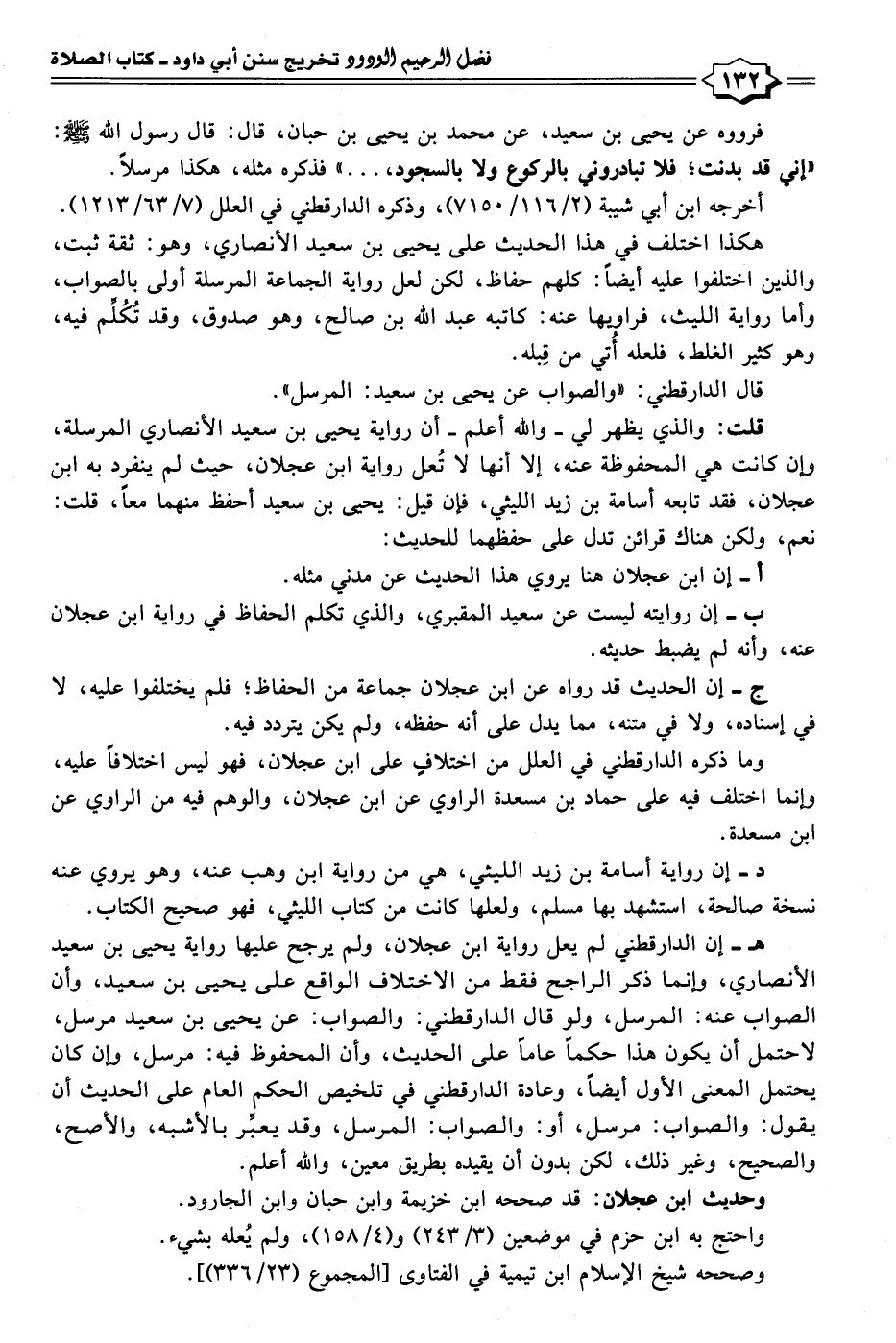 هـ- إن الدارقطني لم يعل رواية ابن عجلان، ولم يرجح عليها رواية يحيى بن سعيد الأنصاري، وإنما ذكر الراجح فقط من الاختلاف الواقع على يحيى بن سعيد، وأن الصواب عنه: المرسل، ولو قال الدارقطني: والصواب: عن يحيى بن سعيد مرسل، لاحتمل أن يكون هذا حكمًا عامًّا على الحديث، وأن المحفوظ فيه: مرسل، وإن كان يحتمل المعنى الأول أيضًا، وعادة الدارقطني في تلخيص الحكم العام على الحديث أن يقول: والصواب: مرسل، أو: والصواب: المرسل، وقد يعبِّر بالأشبه، والأصح، والصحيح، وغير ذلك، لكن بدون أن يقيده بطريق معين، والله أعلم.