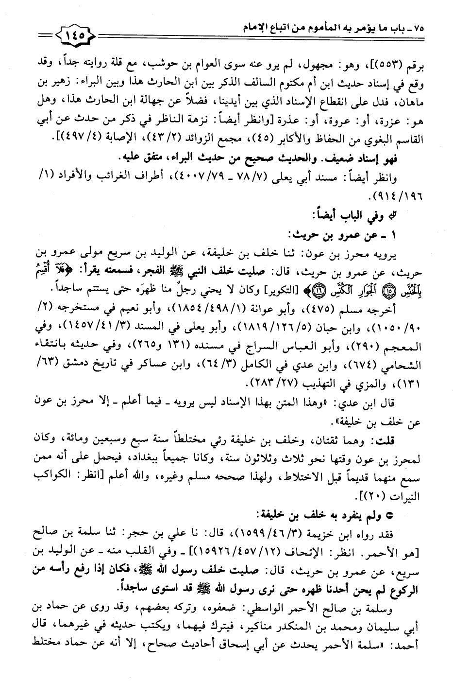 يرويه محرز بن عون: ثنا خلف بن خليفة، عن الوليد بن سريع مولى عمرو بن حريث، عن عمرو بن حريث، قال: صليت خلف النبي - صلى الله عليه وسلم - الفجر، فسمعته يقرأ: {فَلَا أُقْسِمُ بِالْخُنَّسِ (١٥) الْجَوَارِ الْكُنَّسِ} [التكوير] وكان لا يحني رجلٌ منا ظهرَه حتى يستتم ساجدًا.