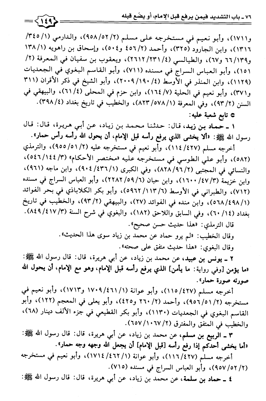 ١ - حماد بن زيد، قال: حدثنا محمد بن زياد، عن أبي هريرة، قال: قال رسول الله - صلى الله عليه وسلم -: "ألا يخشى الذي يرفع رأسه قبل الإمام، أن يحول الله رأسه رأس حمار".