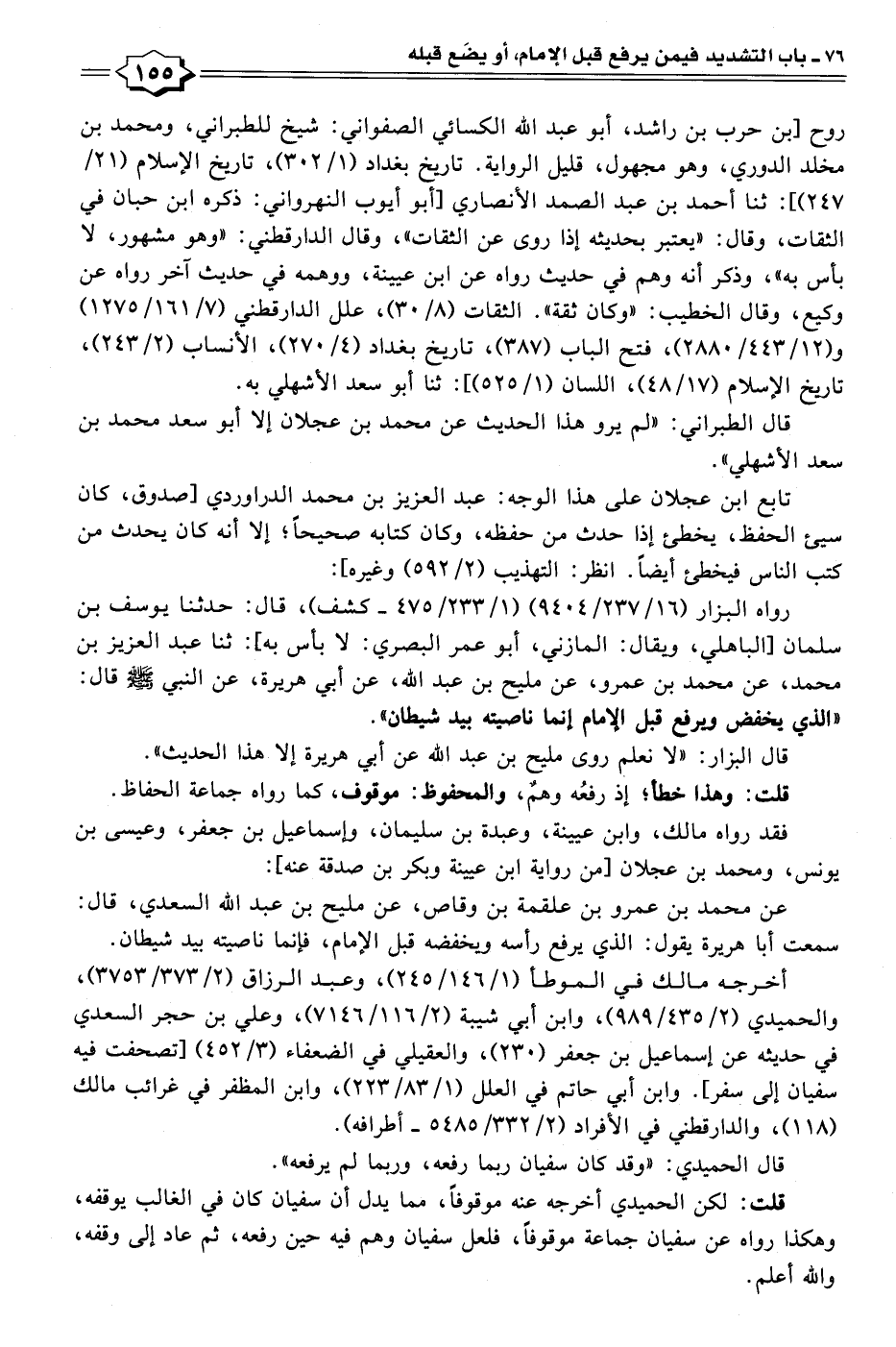 عن محمد بن عمرو بن علقمة بن وقاص، عن مليح بن عبد الله السعدي، قال: سمعت أبا هريرة يقول: الذي يرفع رأسه ويخفضه قبل الإمام، فإنما ناصيته بيد شيطان.