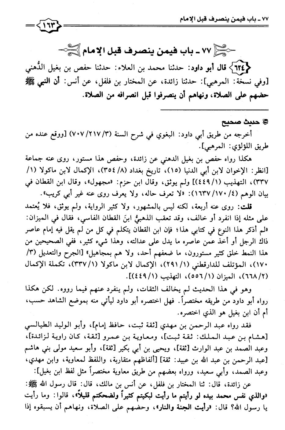 ٦٢٤ - قال أبو داود: حدثنا محمد بن العلاء: حدثنا حفص بن بغيل الدُّهني [وفي نسخة: المرهبي]: حدثنا زائدة، عن المختار بن فلفل، عن أنس: أن النبي - صلى الله عليه وسلم - حضهم على الصلاة، ونهاهم أن ينصرفوا قبل انصرافه من الصلاة.