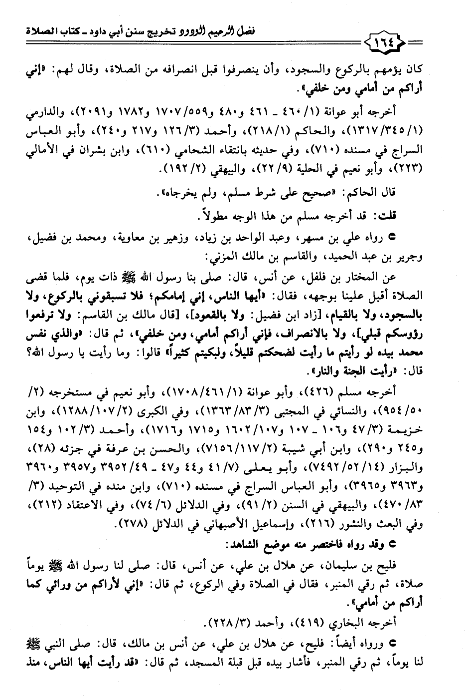 عن المختار بن فلفل، عن أنس، قال: صلى بنا رسول الله - صلى الله عليه وسلم - ذات يوم، فلما قضى الصلاة أقبل علينا بوجهه، فقال: "أيها الناس، إني إمامكم؛ فلا تسبقوني بالركوع، ولا بالسجود، ولا بالقيام، [زاد ابن فضيل: ولا بالقعود]، [قال مالك بن القاسم: ولا ترفعوا رؤوسكم قبلي]، ولا بالانصراف، فإني أراكم أمامي، ومن خلفي"، ثم قال: "والذي نفس محمد بيده لو رأيتم ما رأيت لضحكيم قليلًا، ولبكيتم كثيرًا" قالوا: وما رأيت يا رسول الله؟ قال: "رأيت الجنة والنار".