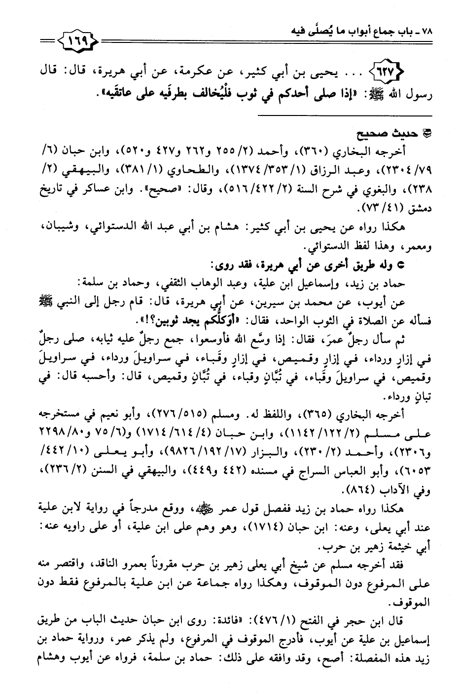 ٦٢٧ - . . . يحيى بن أبي كثير، عن عكرمة، عن أبي هريرة، قال: قال رسول الله - صلى الله عليه وسلم -: "إذا صلى أحدكم في ثوب فلْيُخالف بطرفَيه على عاتقَيه".