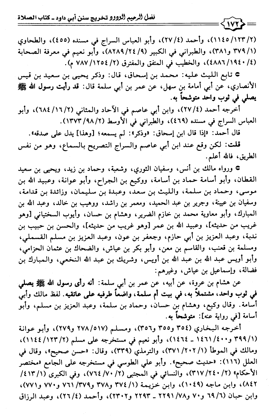 • تابع الليث عليه: محمد بن إسحاق، قال: وذكر يحيى بن سعيد بن قيس الأنصاري، عن أبي أمامة بن سهل، عن عمر بن أبي سلمة قال: قد رأيت رسول الله - صلى الله عليه وسلم - يصلي في ثوب واحد متوشحًا به.