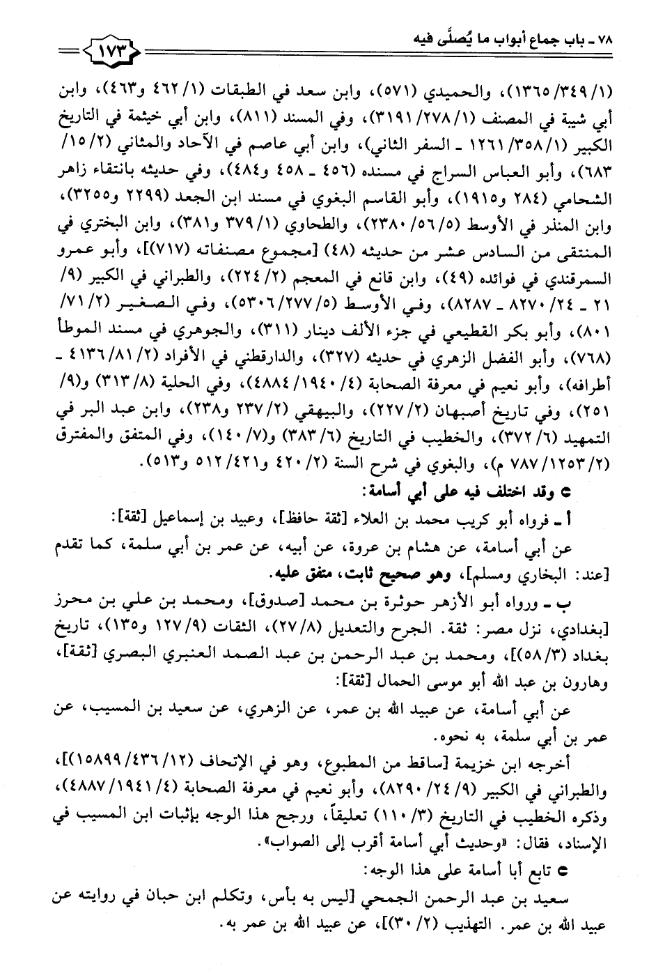 (١/ ٣٤٩/ ١٣٦٥)، والحميدي (٥٧١)، وابن سعد في الطبقات (١/ ٤٦٢ و ٤٦٣)، وابن أبي شيبة في المصنف (١/ ٢٧٨/ ٣١٩١)، وفي المسند (٨١١)، وابن أبي خيثمة في التاريخ الكبير (١/ ٣٥٨/ ١٢٦١ - السفر الثاني)، وابن أبي عاصم في الآحاد والمثاني (٢/ ١٥/ ٦٨٣)، وأبو العباس السراج في مسنده (٤٥٦ - ٤٥٨ و ٤٨٤)، وفي حديثه بانتقاء زاهر الشحامي (٢٨٤ و ١٩١٥)، وأبو القاسم البغوي في مسند ابن الجعد (٢٢٩٩ و ٣٢٥٥)، وابن المنذر في الأوسط (٥/ ٥٦/ ٢٣٨٠)، والطحاوي (١/ ٣٧٩ و ٣٨١)، وابن البختري في المنتقى من السادس عشر من حديثه (٤٨) [مجموع مصنفاته (٧١٧)]، وأبو عمرو السمرقندي في فوائده (٤٩)، وابن قانع في المعجم (٢/ ٢٢٤)، والطبراني في الكبير (٩/ ٢١ - ٢٤/ ٨٢٧٠ - ٨٢٨٧)، وفي الأوسط (٥/ ٢٧٧/ ٥٣٠٦)، وفي الصغير (٢/ ٧١/ ٨٠١)، وأبو بكر القطيعي في جزء الألف دينار (٣١١)، والجوهري في مسند الموطأ (٧٦٨)، وأبو الفضل الزهري في حديثه (٣٢٧)، والدارقطني في الأفراد (٢/ ٨١/ ٤١٣٦ - أطرافه)، وأبو نعيم في معرفة الصحابة (٤/ ١٩٤٠/ ٤٨٨٤)، وفي الحلية (٨/ ٣١٣) و (٩/ ٢٥١)، وفي تاريخ أصبهان (٢/ ٢٢٧)، والبيهقي (٢/ ٢٣٧ و ٢٣٨)، وابن عبد البر في التمهيد (٦/ ٣٧٢)، والخطيب في التاريخ (٦/ ٣٨٣) و (٧/ ١٤٠)، وفي المتفق والمفترق (٢/ ١٢٥٣/ ٧٨٧ م)، والبغوي في شرح السنة (٢/ ٤٢٥ و ٤٢١/ ٥١٢ و ٥١٣).