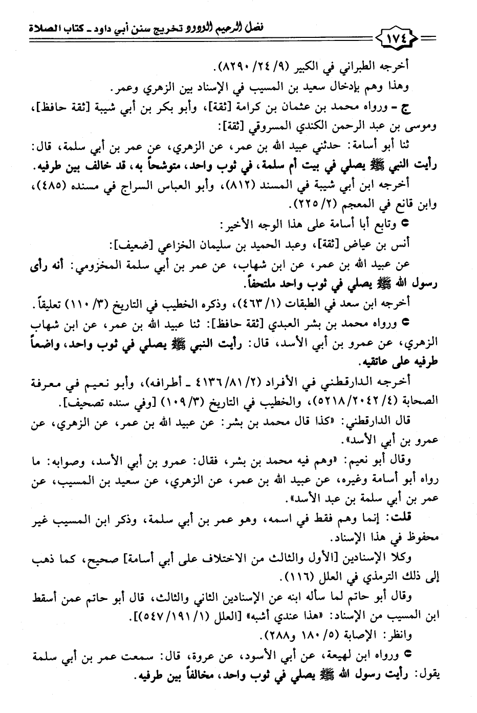 • ورواه محمد بن بشر العبدي [ثقة حافظ]: ثنا عبيد الله بن عمر، عن ابن شهاب الزهري، عن عمرو بن أبي الأسد، قال: رأيت النبي - صلى الله عليه وسلم - يصلي في ثوب واحد، واضعًا طرفيه على عاتقيه.