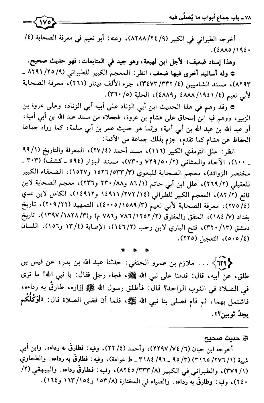٦٢٩ - . . . ملازم بن عمرو الحنفي: حدثنا عبد الله بن بدر، عن قيس بن طلق، عن أبيه، قال: قدمنا على نبي الله - صلى الله عليه وسلم -، فجاء رجل فقال: يا نبي الله! ما ترى في الصلاة في الثوب الواحد؟ قال: فأطلق رسول الله - صلى الله عليه وسلم - إزاره، طارقٌ به رداءه، فاشتمل بهما، ثم قام فصلى بنا نبي الله - صلى الله عليه وسلم -، فلما أن قضى الصلاة قال: "أوَكُلُّكُم يجدُ ثوبين؟ ".