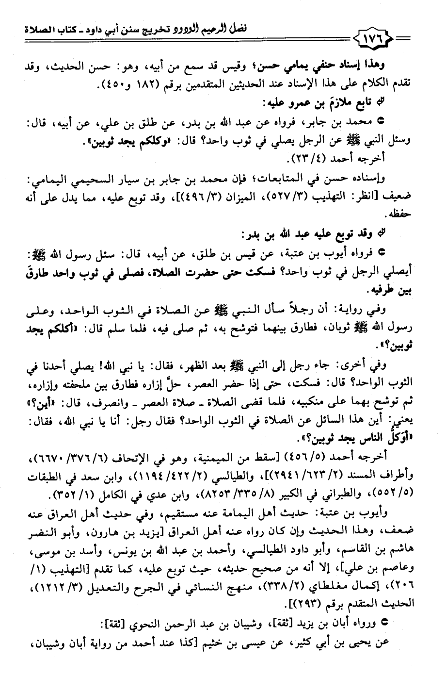 • محمد بن جابر، فرواه عن عبد الله بن بدر، عن طلق بن علي، عن أبيه، قال: وسئل النبي - صلى الله عليه وسلم - عن الرجل يصلي في ثوب واحد؟ قال: "وكلكم يجد ثوبين".