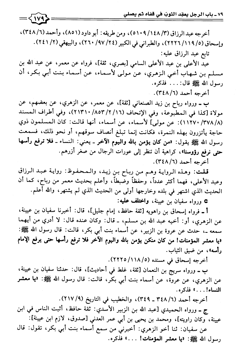 أ- فرواه إسحاق بن راهويه [ثقة حافظ، إمام جليل]، قال: أخبرنا سفيان بن عيينة، عن الزهري، أو: أخيه عبد الله بن مسلم، -قال: وكان عنده قال: لا أدري من أيهما سمعه-، حدث عن عروة بن الزبير، عن أسماء بنت أبي بكر، قالت: قال رسول الله - صلى الله عليه وسلم -: "يا معشر المؤمنات! من كان منكن يؤمن بالله واليوم الآخر فلا ترفع رأسها حتى يرفع الإمام رأسه"، من ضيق الثياب.