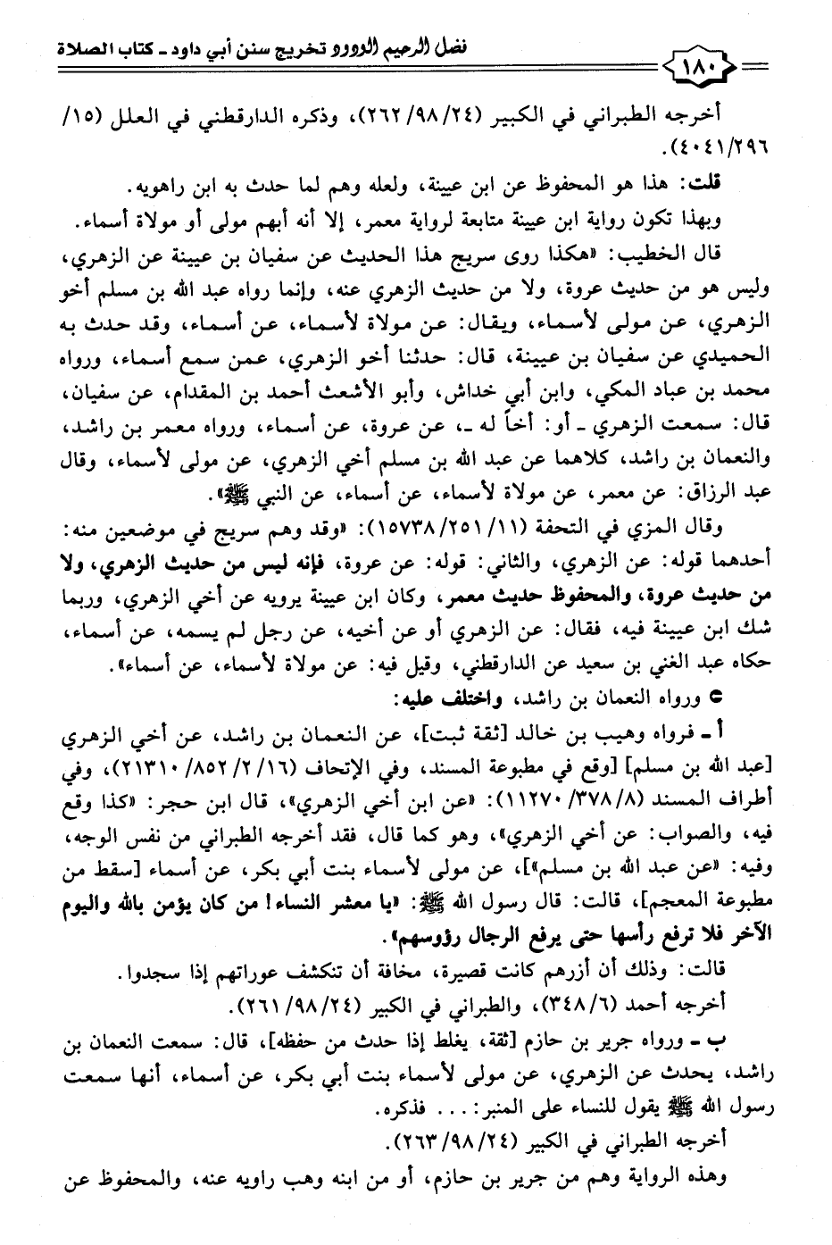 أ- فرواه وهيب بن خالد [ثقة ثبت]، عن النعمان بن راشد، عن أخي الزهري [عبد الله بن مسلم] [وقع في مطبوعة المسند، وفي الإتحاف (١٦/ ٢/ ٨٥٢/ ٢١٣١٠)، وفي أطراف المسند (٨/ ٣٧٨/ ١١٢٧٠): "عن ابن أخي الزهري"، قال ابن حجر: "كذا وقع فيه، والصواب: عن أخي الزهري"، وهو كما قال، فقد أخرجه الطبراني من نفس الوجه، وفيه: "عن عبد الله بن مسلم"]، عن مولى لأسماء بنت أبي بكر، عن أسماء [سقط من مطبوعة المعجم]، قالت: قال رسول الله - صلى الله عليه وسلم -: "يا معشر النساء! من كان يؤمن بالله واليوم الآخر فلا ترفع رأسها حتى يرفع الرجال رؤوسهم".