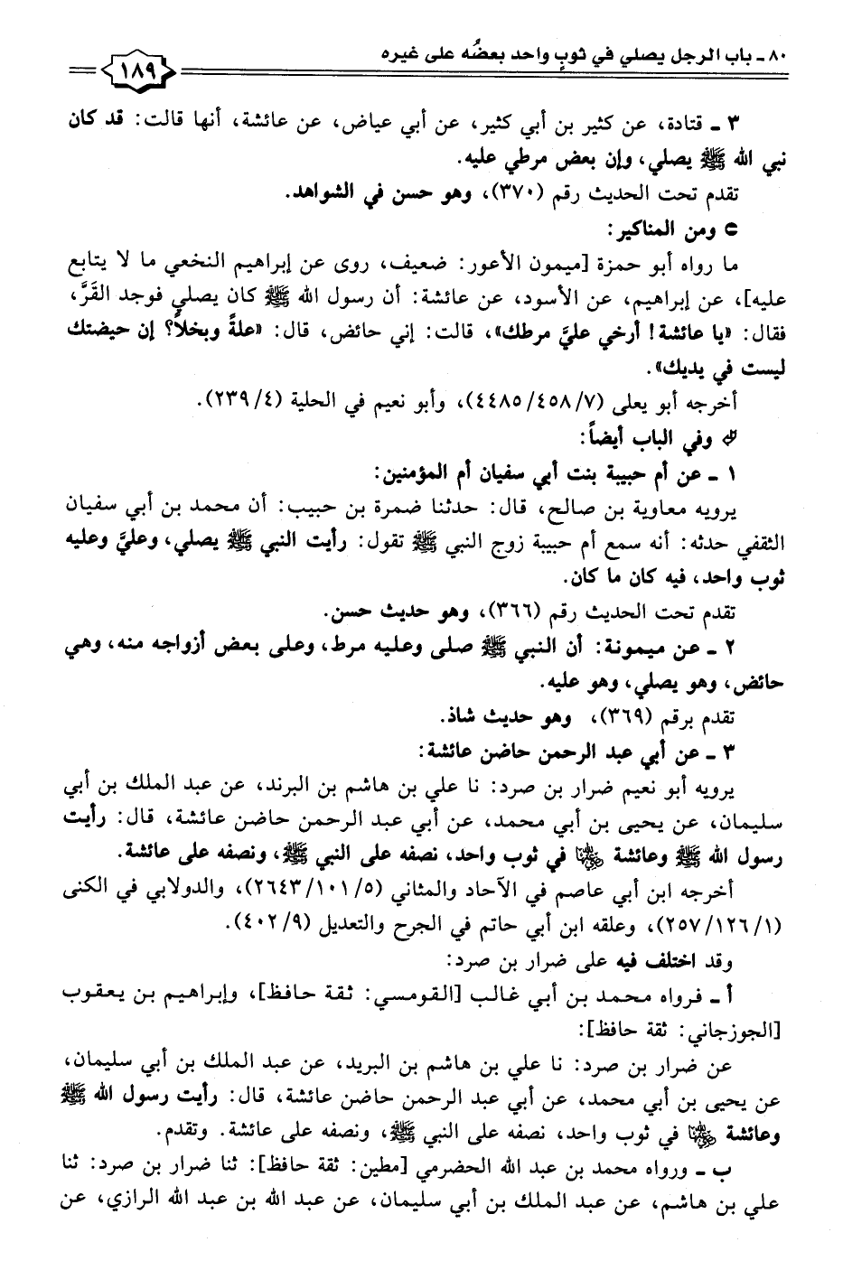 يرويه معاوية بن صالح، قال: حدثنا ضمرة بن حبيب: أن محمد بن أبي سفيان الثقفي حدثه: أنه سمع أم حبيبة زوج النبي - صلى الله عليه وسلم - تقول: رأيت النبي - صلى الله عليه وسلم - يصلي، وعليَّ وعليه ثوب واحد، فيه كان ما كان.