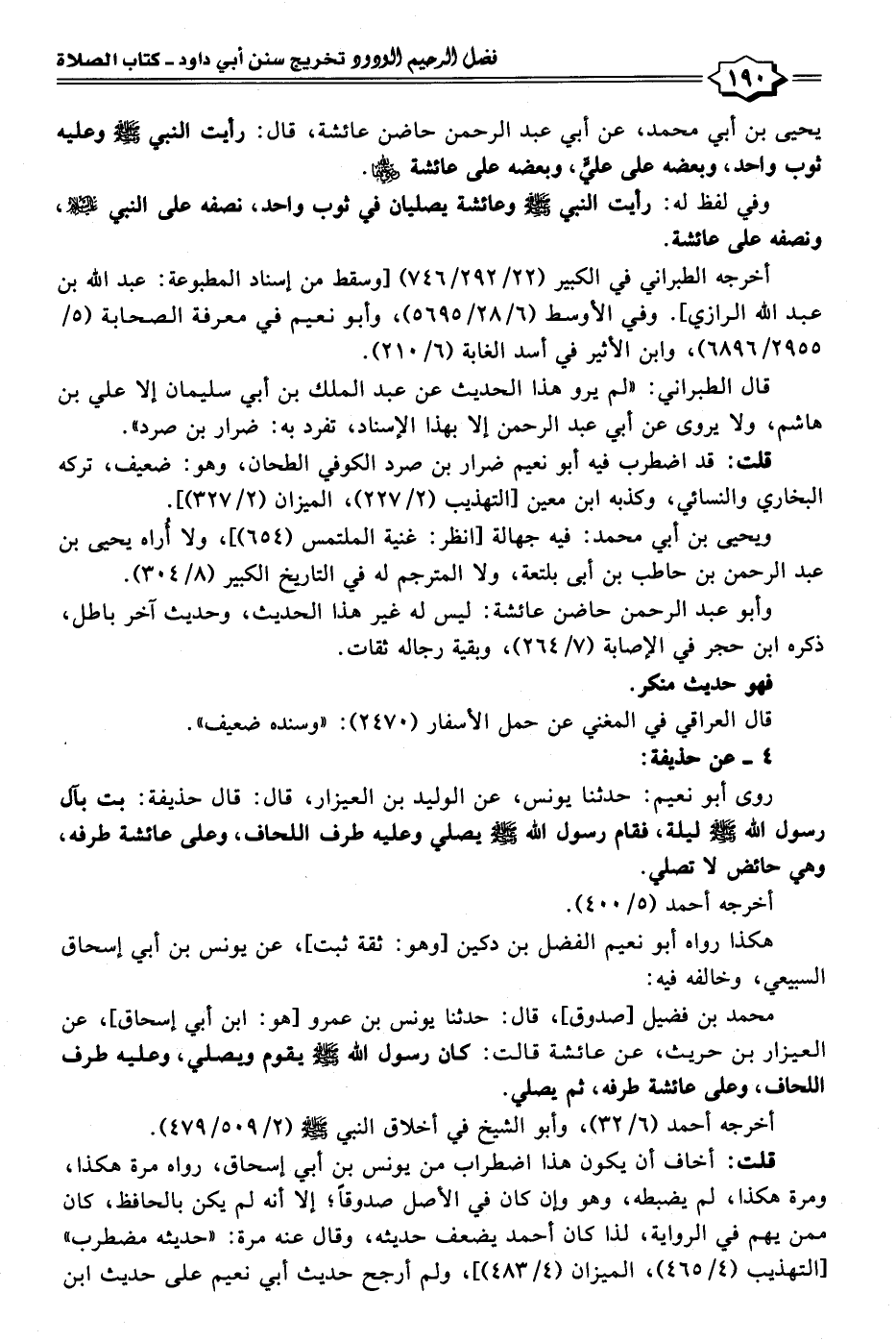 محمد بن فضيل [صدوق]، قال: حدثنا يونس بن عمرو [هو: ابن أبي إسحاق]، عن العيزار بن حريث، عن عائشة قالت: كان رسول الله - صلى الله عليه وسلم - يقوم ويصلي، وعليه طرف اللحاف، وعلى عائشة طرفه، ثم يصلي.
