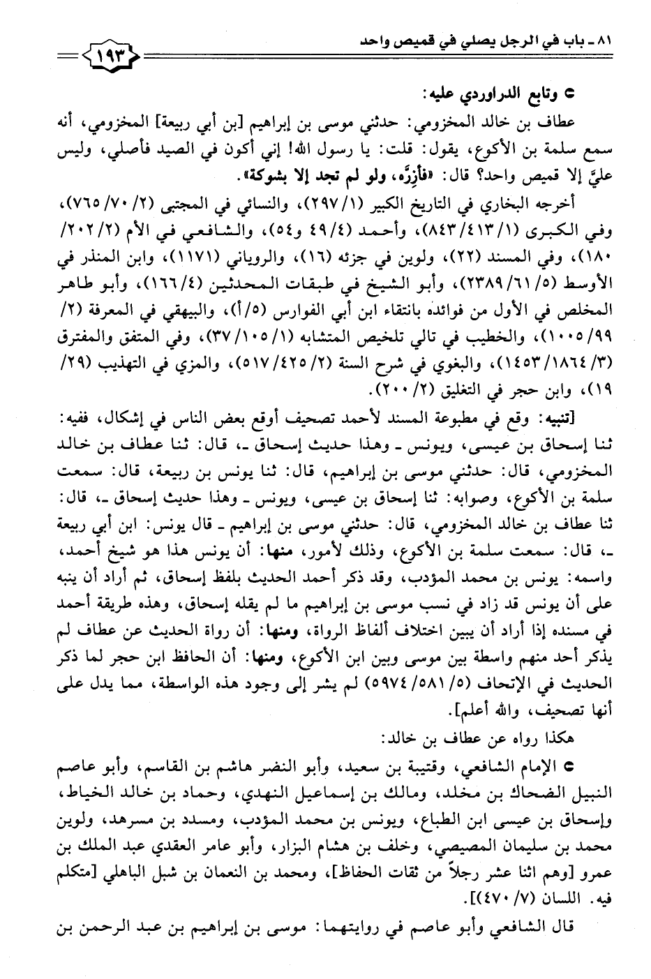 عطاف بن خالد المخزومي: حدثني موسى بن إبراهيم أبن أبي ربيعة، المخزومي، أنه سمع سلمة بن الأكوع، يقول: قلت: يا رسول الله! إني أكون في الصيد فأصلي، وليس عليَّ إلا قميص واحد؟ قال: "فأزِرَّه، ولو لم تجد إلا بشوكة".