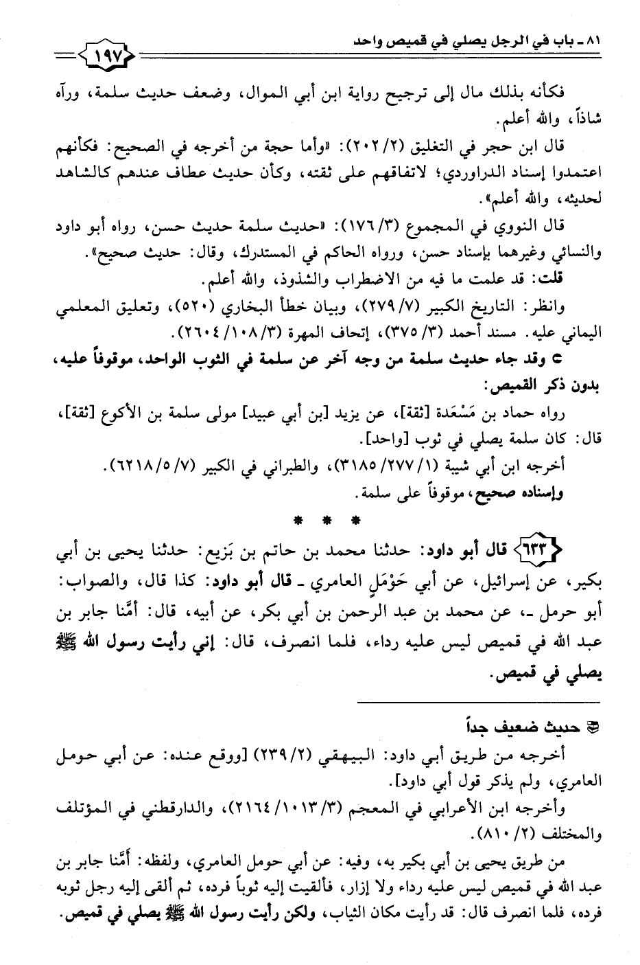 ٦٣٣ - قال أبو داود: حدثنا محمد بن حاتم بن بَزيع: حدثنا يحيى بن أبي بكير، عن إسرائيل، عن أبي حَوْمَل العامري -قال أبو داود: كذا قال، والصواب: أبو حرمل-، عن محمد بن عبد الرحمن بن أبي بكر، عن أبيه، قال: أمَّنا جابر بن عبد اللَّه في قميص ليس عليه رداء، فلما انصرف، قال: اني رأيت رسول الله - صلى الله عليه وسلم - يصلي في قميص.