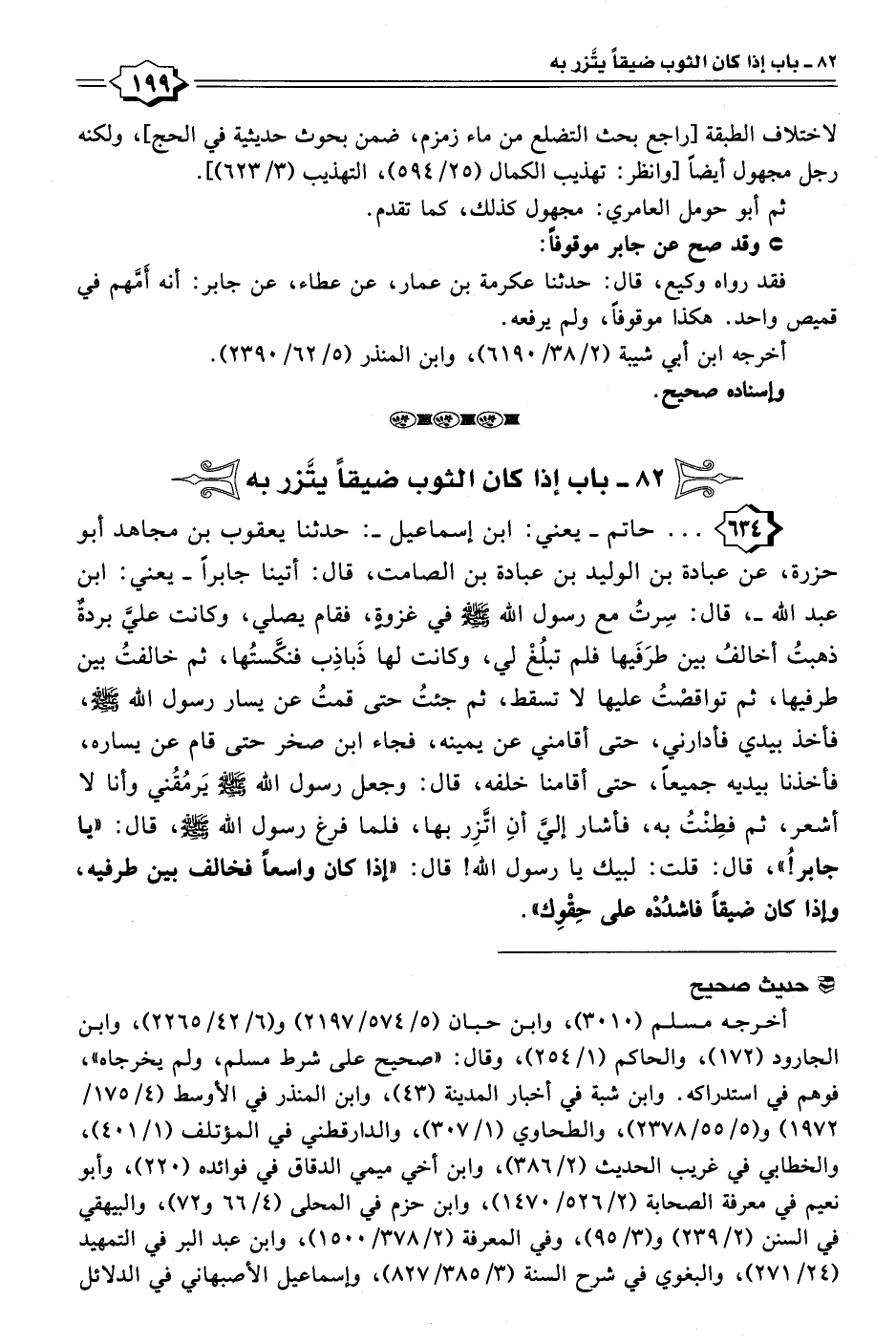 ٦٣٤ - . . . حاتم -يعني: ابن إسماعيل-: حدثنا يعقوب بن مجاهد أبو حزرة، عن عبادة بن الوليد بن عبادة بن الصامت، قال: أتينا جابرًا -يعني: ابن عبد الله-، قال: سِرتُ مع رسول الله - صلى الله عليه وسلم - في غزوةٍ، فقام يصلي، وكانت عليَّ بردةٌ ذهبتُ أخالفُ بين طرَفَيها فلم تبلُغْ لي، وكانت لها ذَباذِب فنكَّستُها، ثم خالفتُ بين طرفيها، ثم تواقصْتُ عليها لا تسقط، ثم جئتُ حتى قمتُ عن يسار رسول الله - صلى الله عليه وسلم -، فأخذ بيدي فأدارني، حتى أقامني عن يمينه، فجاء ابن صخر حتى قام عن يساره، فأخذنا بيديه جميعًا، حتى أقامنا خلفه، قال: وجعل رسول الله - صلى الله عليه وسلم - يَرمُقُني وأنا لا أشعر، ثم فطِنْتُ به، فأشار إليَّ أنِ اتَّزِر بها، فلما فرغ رسول اللَّه - صلى الله عليه وسلم -، قال: "يا جابر! "، قال: قلت: لبيك يا رسول الله! قال: "إذا كان واسعًا فخالف بين طرفيه، وإذا كان ضيقًا فاشدُدْه على حِقْوِك".