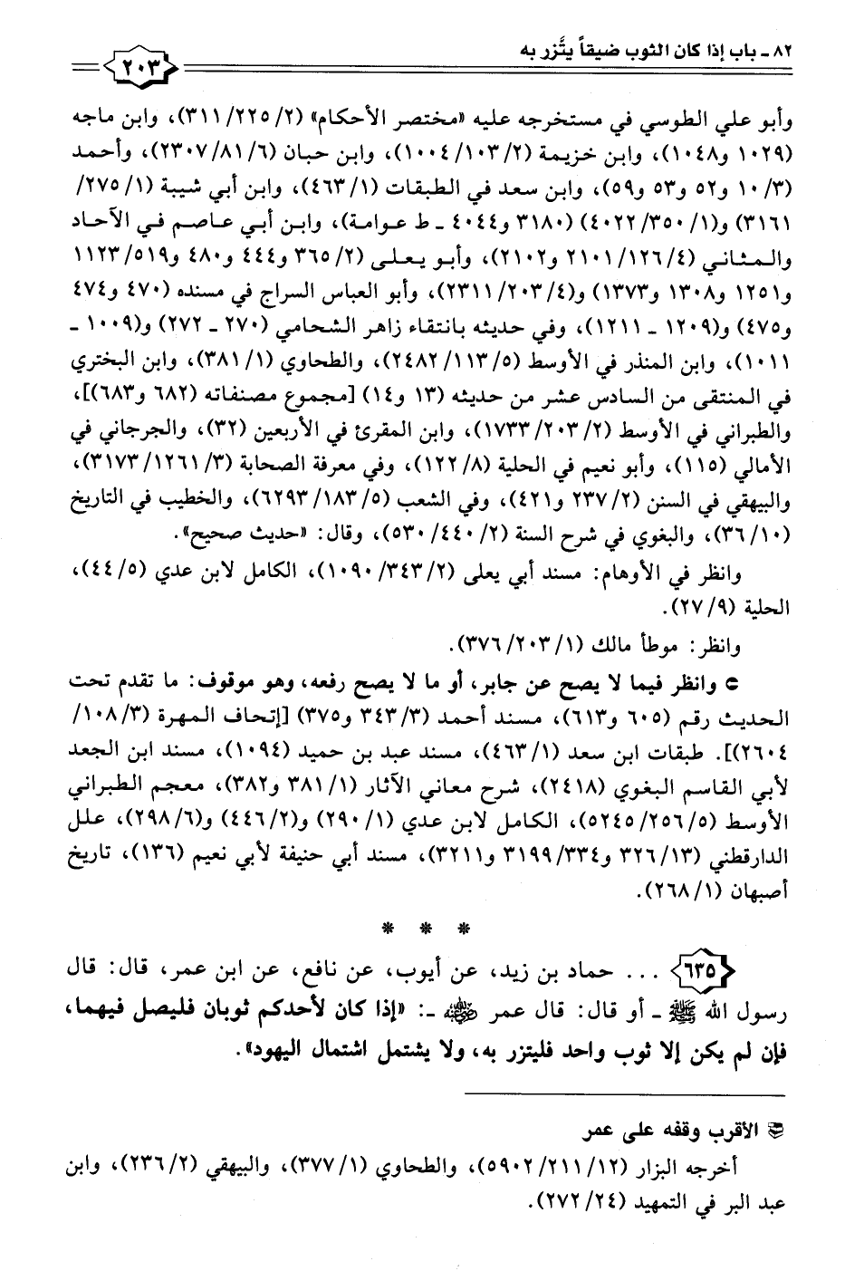 ٦٣٥ - . . . حماد بن زيد، عن أيوب، عن نافع، عن ابن عمر، قال: قال رسول الله - صلى الله عليه وسلم - أو قال: قال عمر - رضي الله عنه -: "إذا كان لأحدكم ثوبان فليصل فيهما، فإن لم يكن إلا ثوب واحد فليتزر به، ولا يشتمل اشتمال اليهود".