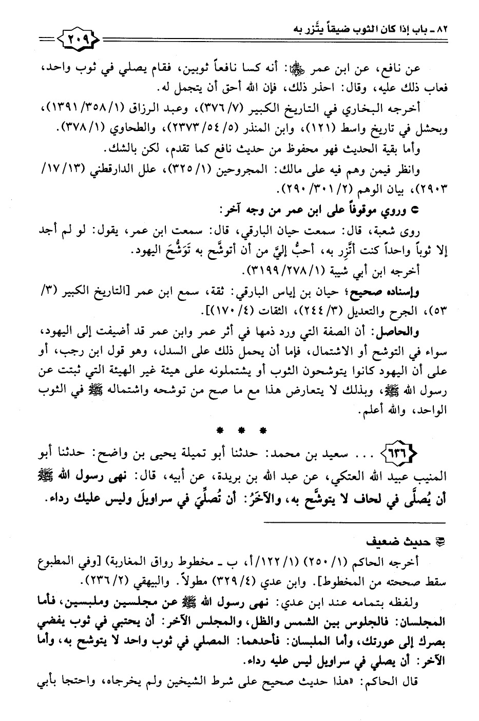 روى شعبة، قال: سمعت حيان البارقي، قال: سمعت ابن عمر، يقول: لو لم أجد إلا ثوبًا واحدًا كنت أتَّزِر به، أحبُّ إليَّ من أن أتوشَّح به تَوَشَّحَ اليهود.
