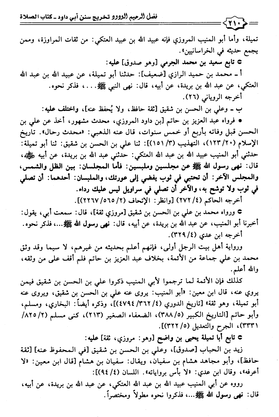 • فرواه عبد العزيز بن حاتم [بن داود المروزي، محدث مشهور، أخذ عن علي بن الحسن قبل وفاته بأربع أو خمس سنوات، قال عنه الذهبي: "محدث رحال". تاريخ الإسلام (٢٠/ ١٢٣)، التهذيب (٣/ ١٥١)]: ثنا علي بن الحسن بن شقيق: ثنا أبو تميلة: حدثني أبو المنيب عبيد الله بن عبد الله العتكي: حدثني عبد الله بن بريدة، عن أبيه - رضي الله عنه -، قال: نهى رسول الله - صلى الله عليه وسلم - عن مجلسين وملبسين: فأما المجلسان: بين الظل والشمس، والمجلس الآخر: أن تحتبي في ثوب يفضي إلى عورتك، والملبسان: أحدهما: أن تصلي في ثوب ولا توشح به، والآخر أن تصلي في سراويل ليس عليك رداء.