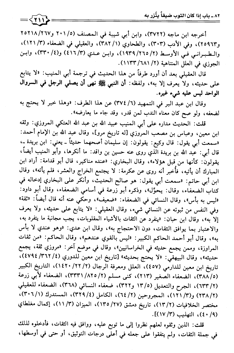 قال العقيلي بعد أن أورد طرفًا من هذا الحديث في ترجمة أبي المنيب: "لا يتابع على حديثه، ولا يعرف إلا به"، ولفظه: أن النبي - صلى الله عليه وسلم - نهى أن يصلي الرجل في السروال الواحد ليس عليه شيء غيره.