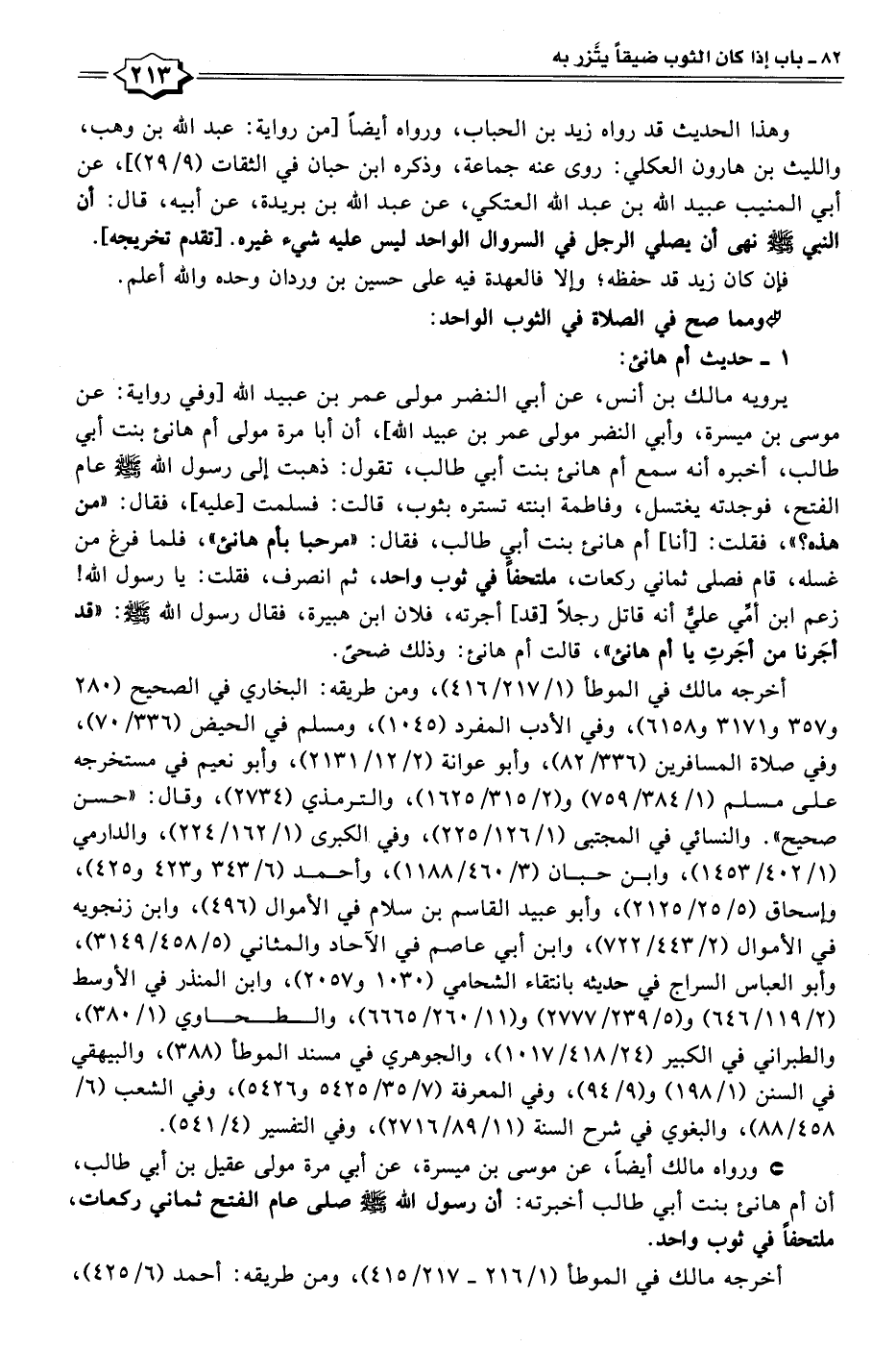 يرويه مالك بن أنس، عن أبي النضر مولى عمر بن عبيد الله [وفي رواية: عن موسى بن ميسرة، وأبي النضر مولى عمر بن عبيد الله]، أن أبا مرة مولى أم هانئ بنت أبي طالب، أخبره أنه سمع أم هانئ بنت أبي طالب، تقول: ذهبت إلى رسول الله - صلى الله عليه وسلم - عام الفتح، فوجدته يغتسل، وفاطمة ابنته تستره بثوب، قالت: فسلمت [عليه]، فقال: "من هذه؟ "، فقلت: [أنا] أم هانئ بنت أبي طالب، فقال: "مرحبا بأم هانئ"، فلما فرغ من غسله، قام فصلى ثماني ركعات، ملتحفًا في ثوب واحد، ثم انصرف، فقلت: يا رسول الله! زعم ابن أمِّي عليٌّ أنه قاتل رجلًا [قد] أجرته، فلان ابن هبيرة، فقال رسول الله - صلى الله عليه وسلم -: "قد أجَرنا من أجَرتِ يا أم هانئ"، قالت أم هانئ: وذلك ضحًى.