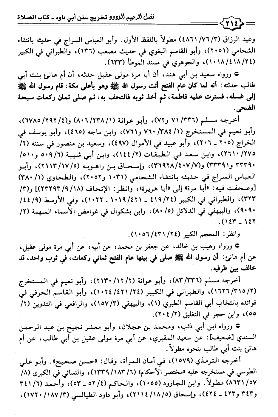 • ورواه سعيد بن أبي هند، أن أبا مرة مولى عقيل حدثه، أن أم هانئ بنت أبي طالب حدثته: أنه لما كان عام الفتح أتت رسول الله - صلى الله عليه وسلم - وهو بأعلى مكة، قام رسول الله - صلى الله عليه وسلم - إلى غسله، فسترت عليه فاطمة، ثم أخذ ثوبه فالتحف به، ثم صلى ثمان ركعات سبحة الضحى.