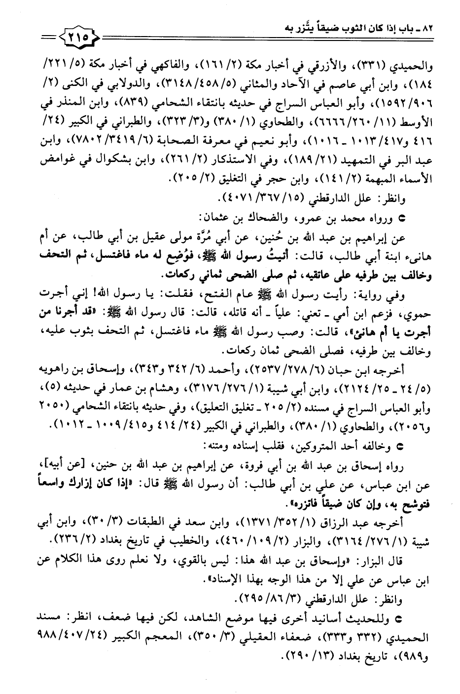 عن إبراهيم بن عبد الله بن حُنين، عن أبي مُرَّة مولى عقيل بن أبي طالب، عن أم هانئ ابنة أبي طالب، قالت: أتيتُ رسول الله - صلى الله عليه وسلم -، فوُضِع له ماء فاغتسل، ثم التحف وخالف بين طرفيه على عاتقيه، ثم صلى الضحى ثماني ركعات.