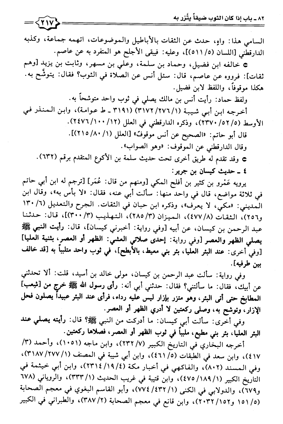 وفي رواية: سألت عبد الرحمن بن كيسان، مولى خالد بن أسيد، قلت: ألا تحدثني عن أبيك، فقال: ما سألتني؟ فقال: حدثني أبي أنه: رأى رسول الله - صلى الله عليه وسلم - خرج من [شِعب] المطابخ حتى أتى البئر، وهو متزر بإزار ليس عليه رداء، فرأى عند البئر عبيدًا يصلون فحل الإزار، وتوشح به، وصلى ركعتين لا أدري الظهر أو العصر.