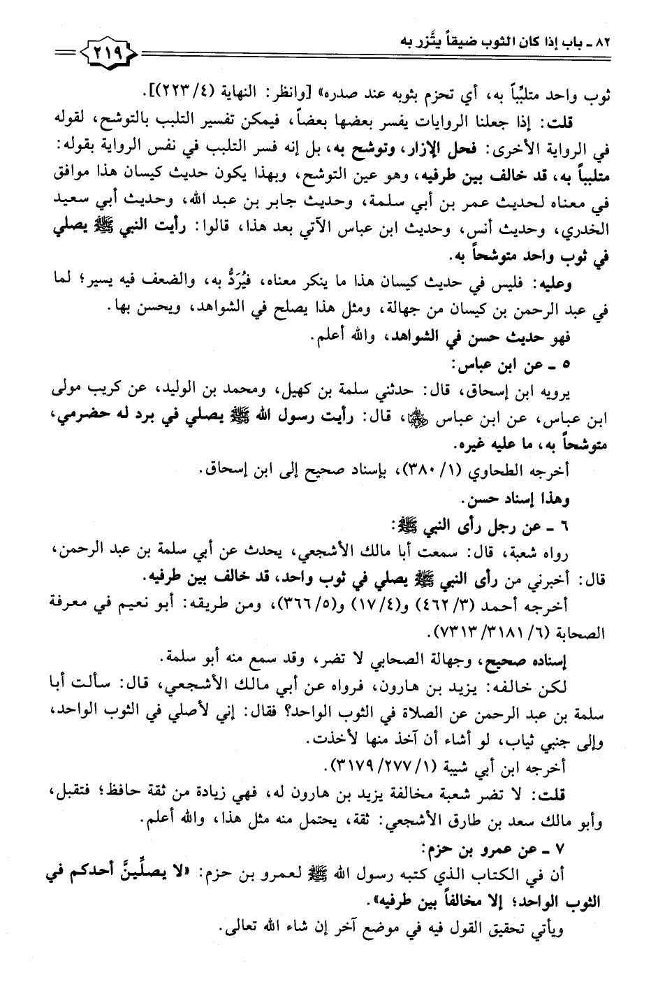 يرويه ابن إسحاق، قال: حدثني سلمة بن كهيل، ومحمد بن الوليد، عن كريب مولى ابن عباس، عن ابن عباس - رضي الله عنهما -، قال: رأيت رسول الله - صلى الله عليه وسلم - يصلي في برد له حضرمي، متوشحًا به، ما عليه غيره.