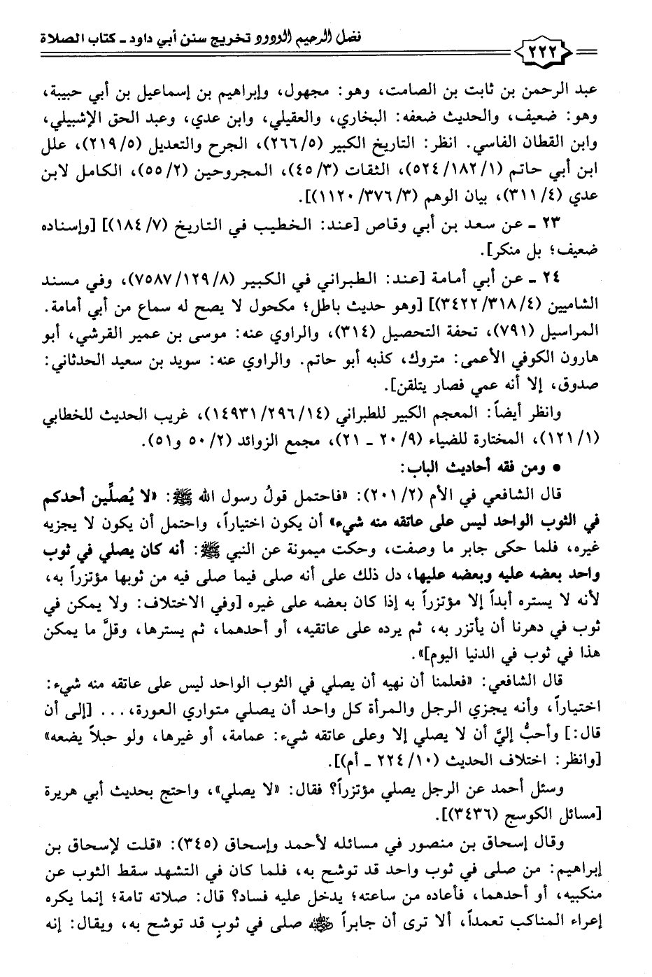 قال الشافعي: "فعلمنا أن نهيه أن يصلي في الثوب الواحد ليس على عاتقه منه شيء: اختيارًا، وأنه يجزي الرجل والمرأة كل واحد أن يصلي متواري العورة،. . . [إلى أن قال:] وأحبُّ إليَّ أن لا يصلي إلا وعلى عاتقه شيء: عمامة، أو غيرها، ولو حبلًا يضعه" [وانظر: اختلاف الحديث (١٠/ ٢٢٤ - أم)].