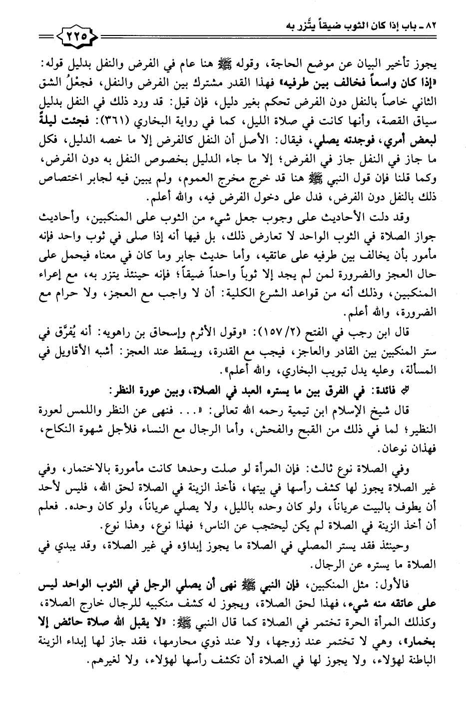 قال ابن رجب في الفتح (٢/ ١٥٧): "وقول الأثرم وإسحاق بن راهويه: أنه يُفرَّق في ستر المنكبين بين القادر والعاجز، فيجب مع القدرة، ويسقط عند العجز: أشبه الأقاويل في المسألة، وعليه يدل تبويب البخاري، والله أعلم".