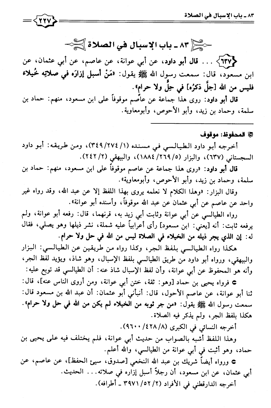 ٦٣٧ - . . . قال أبو داود، عن أبي عوانة، عن عاصم، عن أبي عثمان، عن ابن مسعود، قال: سمعت رسول الله - صلى الله عليه وسلم - يقول: "مَنْ أسبل إزارَه في صلاتِه خُيلاءَ فليس من الله [جلَّ ذكرُه] في حِلٍّ ولا حرامٍ".