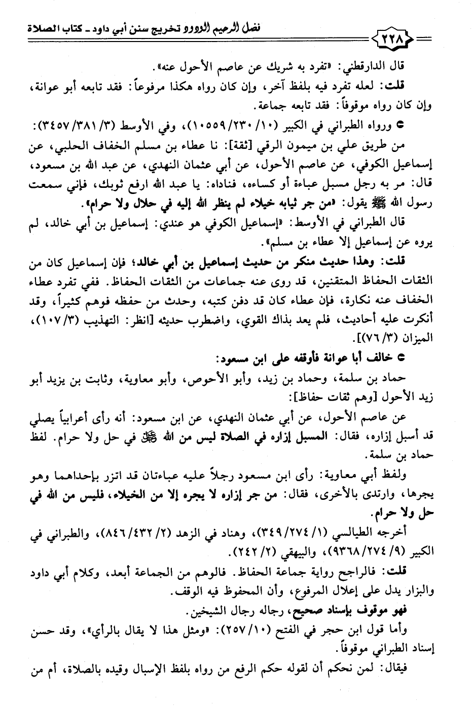 عن عاصم الأحول، عن أبي عثمان النهدي، عن ابن مسعود: أنه رأى أعرابيًّا يصلي قد أسبل إزاره، فقال: المسبل إزاره في الصلاة ليس من الله عز وجل في حل ولا حرام. لفظ حماد بن سلمة.