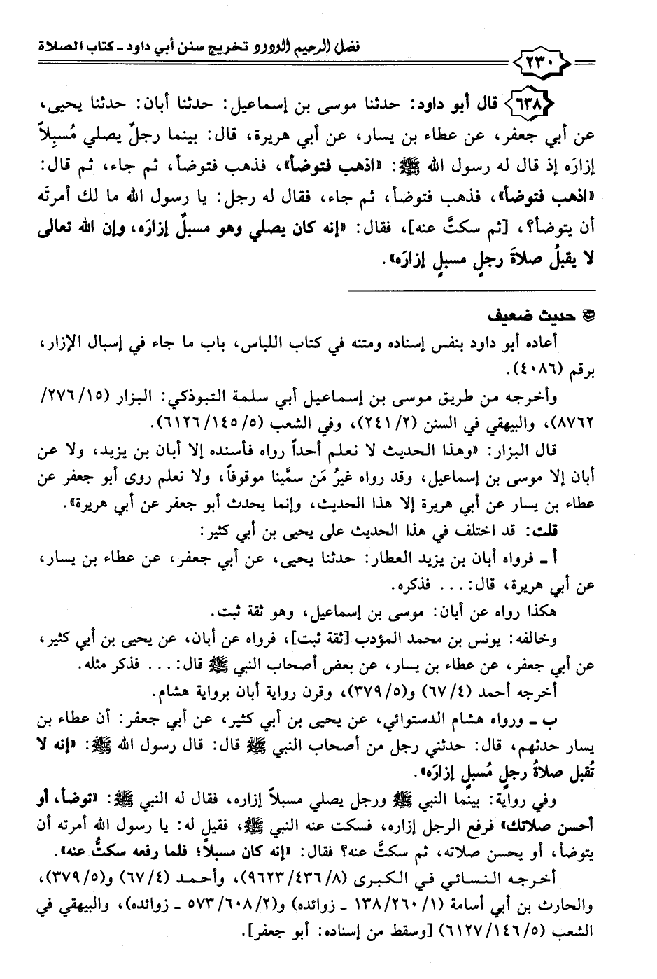٦٣٨ - قال أبو داود: حدثنا موسى بن إسماعيل: حدثنا أبان: حدثنا يحيى، عن أبي جعفر، عن عطاء بن يسار، عن أبي هريرة، قال: بينما رجلٌ يصلي مُسبِلًا إزارَه إذ قال له رسول الله - صلى الله عليه وسلم -: "اذهب فتوضأ"، فذهب فتوضأ، ثم جاء، ثم قال: "اذهب فتوضأ"، فذهب فتوضأ، ثم جاء، فقال له رجل: يا رسول الله ما لك أمرتَه أن يتوضأ؟، [ثم سكتَّ عنه]، فقال: "إنه كان يصلي وهو مسبلٌ إزارَه، وإن الله تعالى لا يقبلُ صلاةَ رجلٍ مسبلٍ إزارَه".
