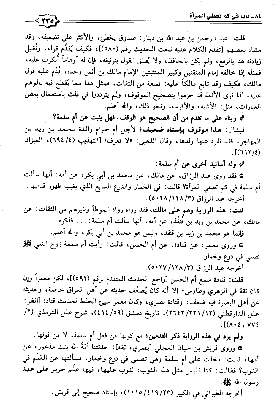 • وروى قريش بن حيان العجلي [بصري، ثقة]: حدثتنا أَمَةُ الله بنت مذعور، عن أمها، قالت: دخلت على أم سلمة وهي تصلي في درع وخمار، فسألتها عن العَلَم في الثوب؟ فقالت: كنا نلبس مثل هذا الثوب، لثوب عليها، فيها عَلَم حرير على عهد رسول الله - صلى الله عليه وسلم -.