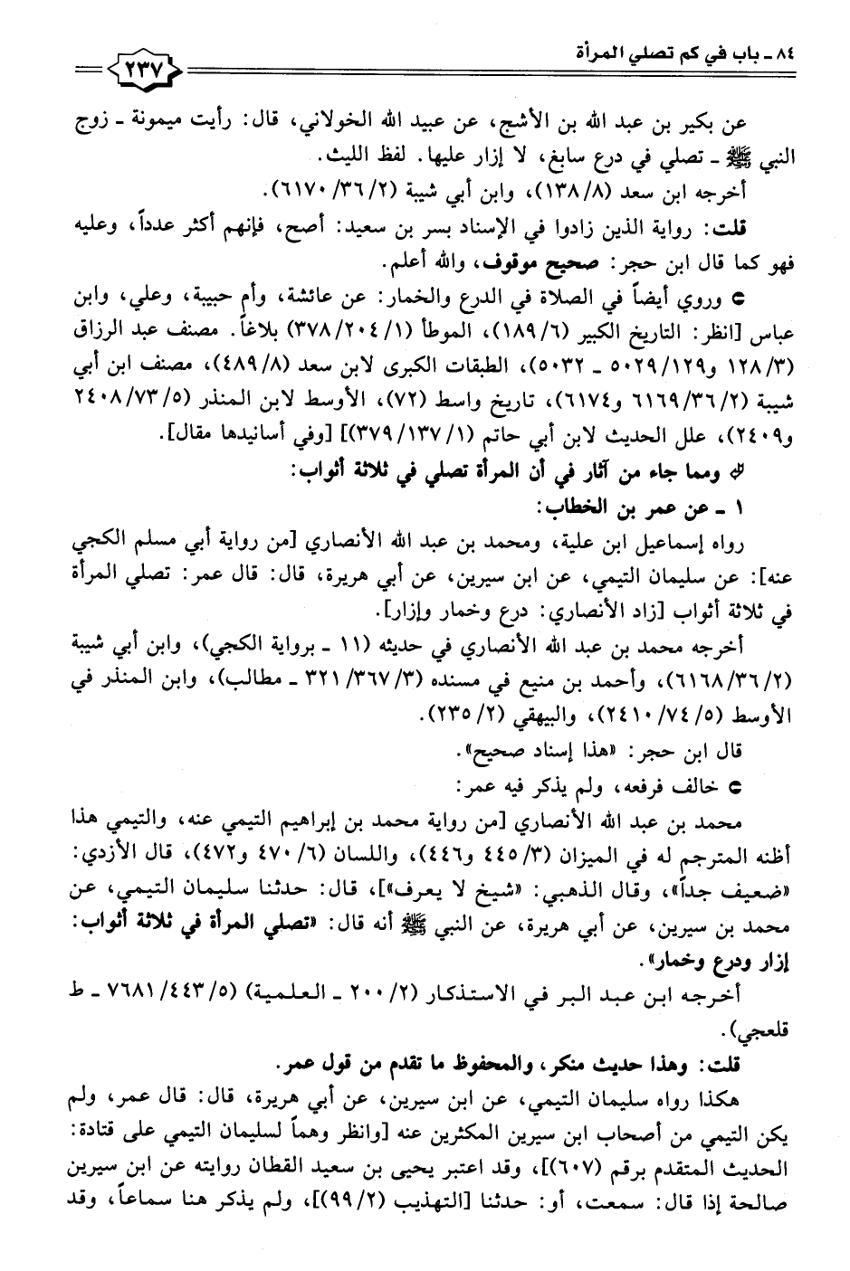 رواه إسماعيل ابن علية، ومحمد بن عبد الله الأنصاري [من رواية أبي مسلم الكجي عنه]: عن سليمان التيمي، عن ابن سيرين، عن أبي هريرة، قال: قال عمر: تصلي المرأة في ثلاثة أثواب [زاد الأنصاري: درع وخمار وإزار].